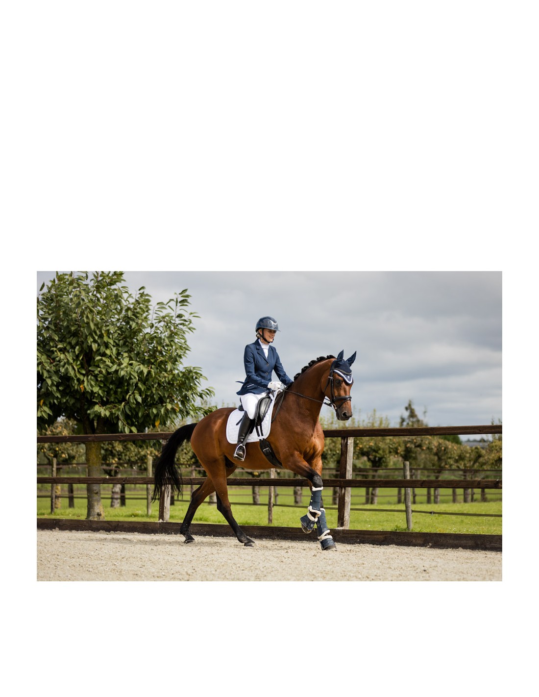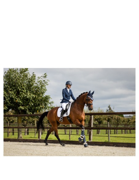 Thanks to the smooth, stretchy Lycra material, the ears fit perfectly around the horse's ears. The ear bonnet is finished in the same style as the saddle pads with a satin insert, a subtly shiny herringbone pattern piping and a silver cord piping.