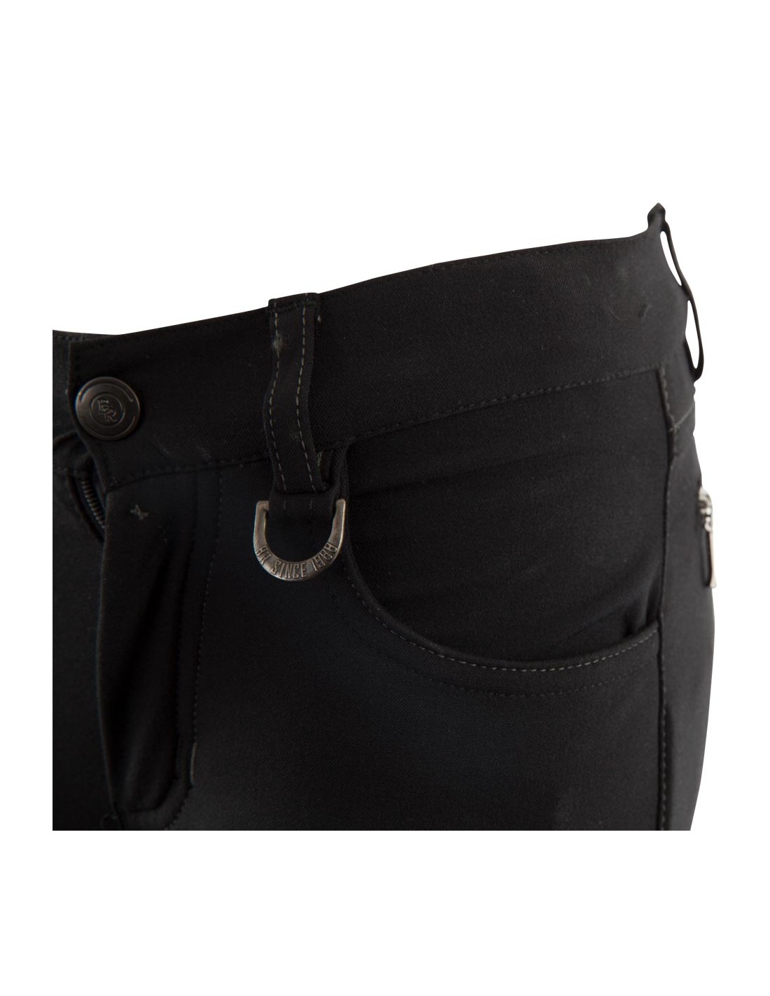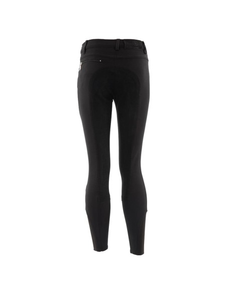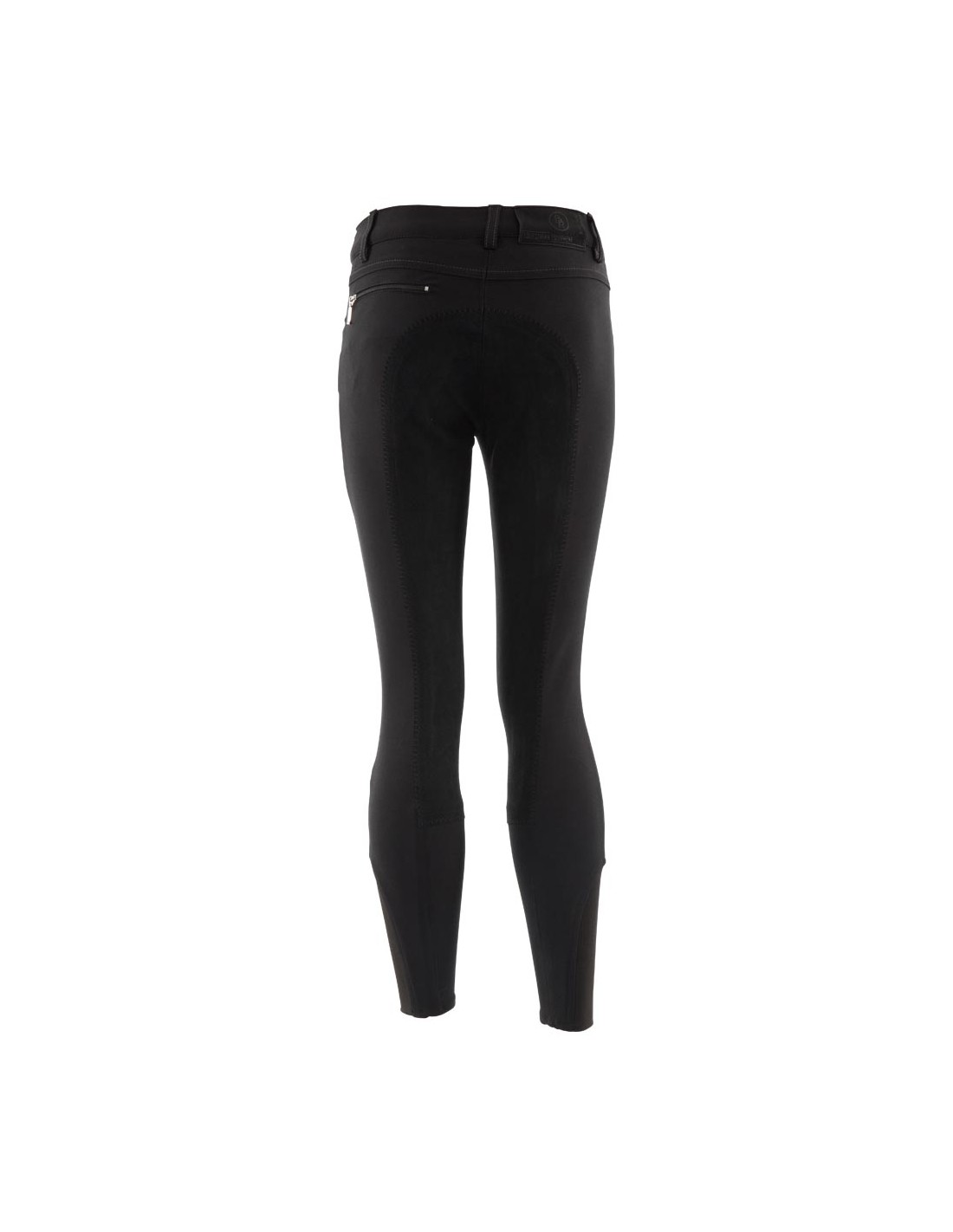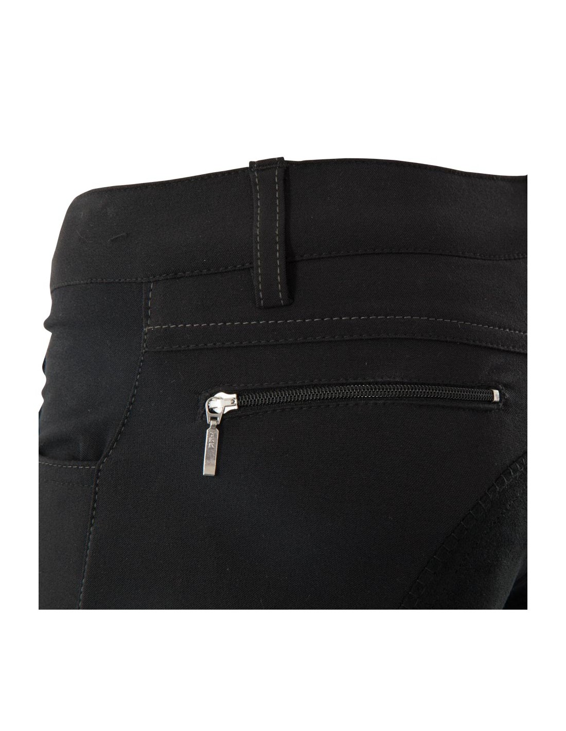 These close fit children’s riding breeches feature a ¾ microfiber seat. The riding breeches feature two jeans pockets and an additional coin pocket at the front and a zipper pockets with YKK zipper at the left back. The buttonhole elastic in the waist can be easily adjusted for a good fit. The waistband features belt loops. The elastic lower leg inserts ensure optimal comfort in the riding boots.