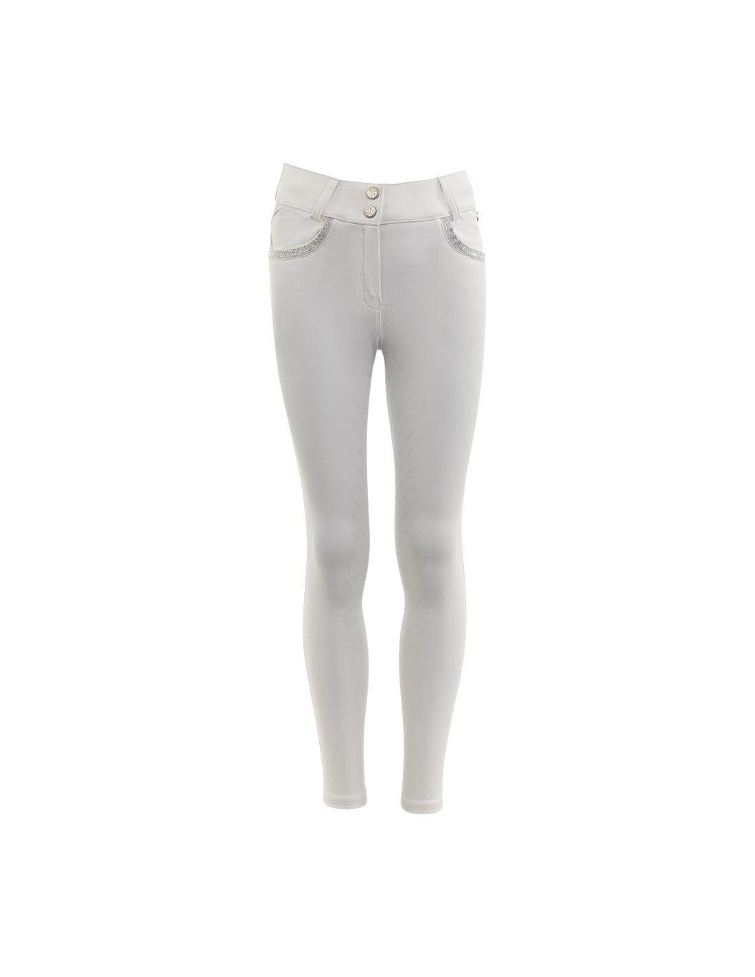 The breeches have a high waistband with two hook and eye closures and buttonhole elastic, so the waistband can be tightened. Some belt loops are embellished with silver glitter material, just like the jeans pockets on the front. There are two zipper pockets on the back.