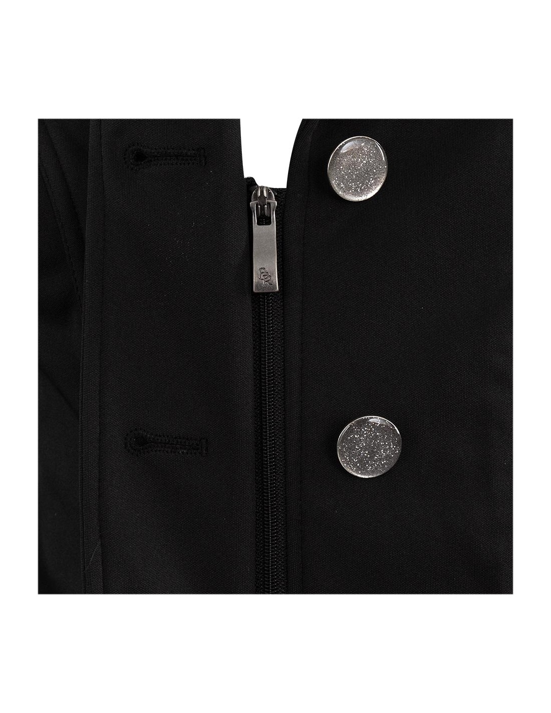 This competition jacket has various glitter elements, such as the striking buttons, the glitter piping on the collar and the glitter tape on the sleeves. The jacket also has two flap pockets.