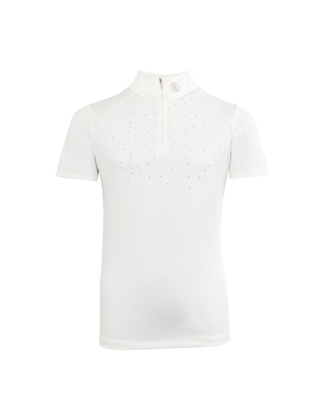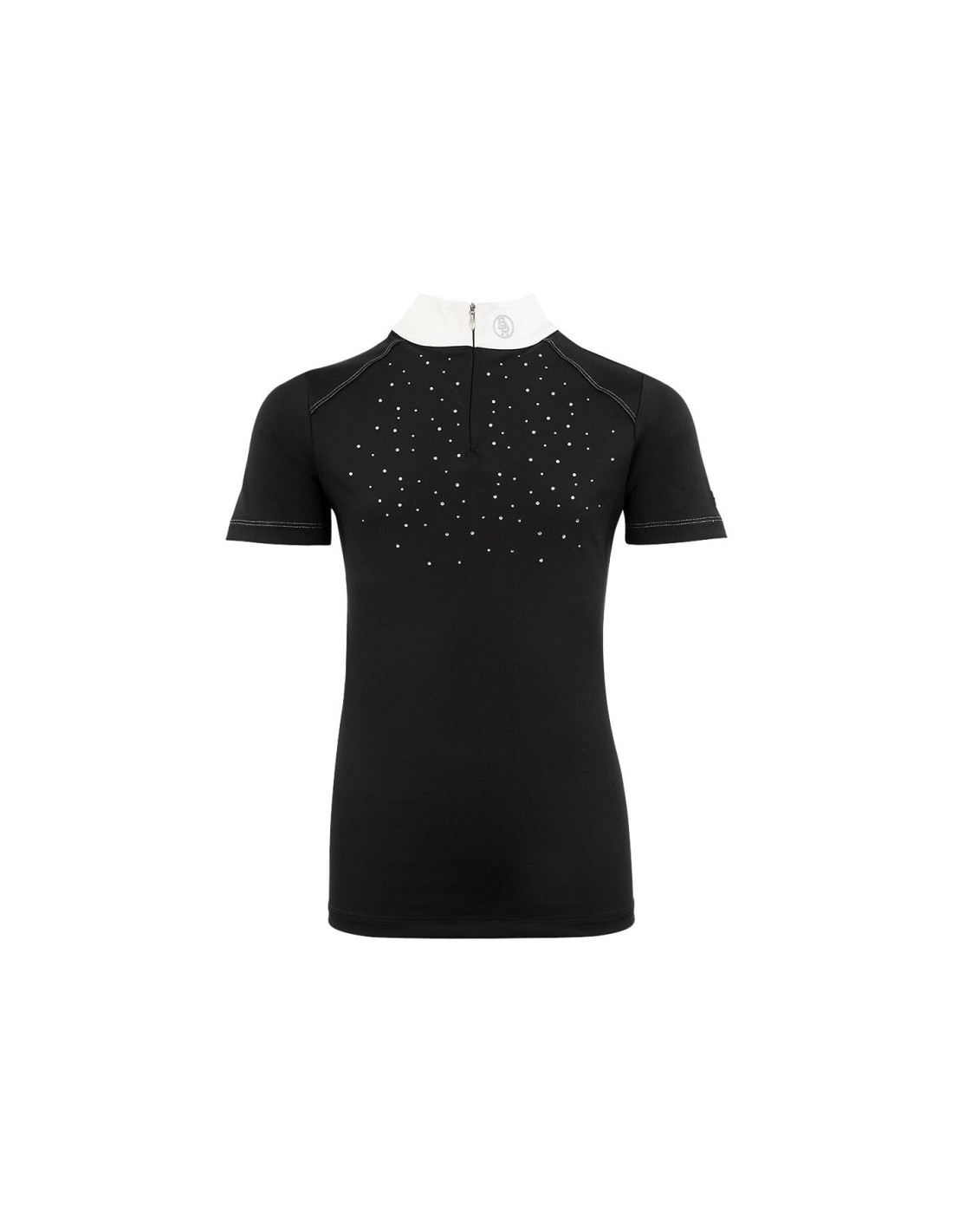 The competition shirt Dudley stands out because of its high wearing comfort and the elegant finish with shiny and silver details. The front features a concealed zipper and a pattern with shiny studs and imitation diamonds. The silver stitching, the white collar and the silver brand logos complete the competition look in a stylish way.