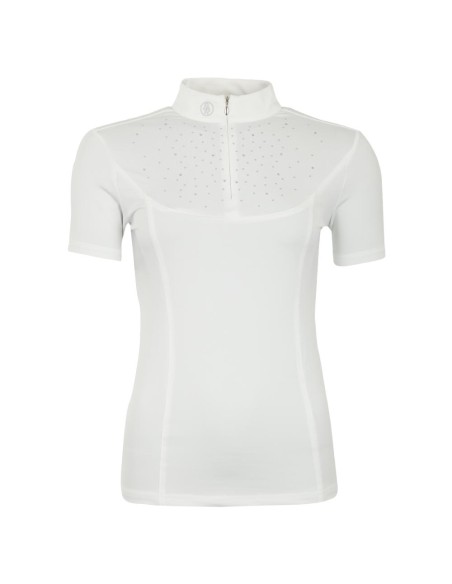 This competition shirt dries quick and has wicking qualities, therefore making it suitable to wear on warmer days as well. The stretch fabric ensures a comfortable fit. Imitation diamonds and studs alternate each other on the chest for a sporty and elegant appearance. The shirt features a hidden zipper closure on the chest. The shirt is embellished with a subtle BR logo made of silicone on the collar and a silver coloured metal BR logo at the left sleeve.