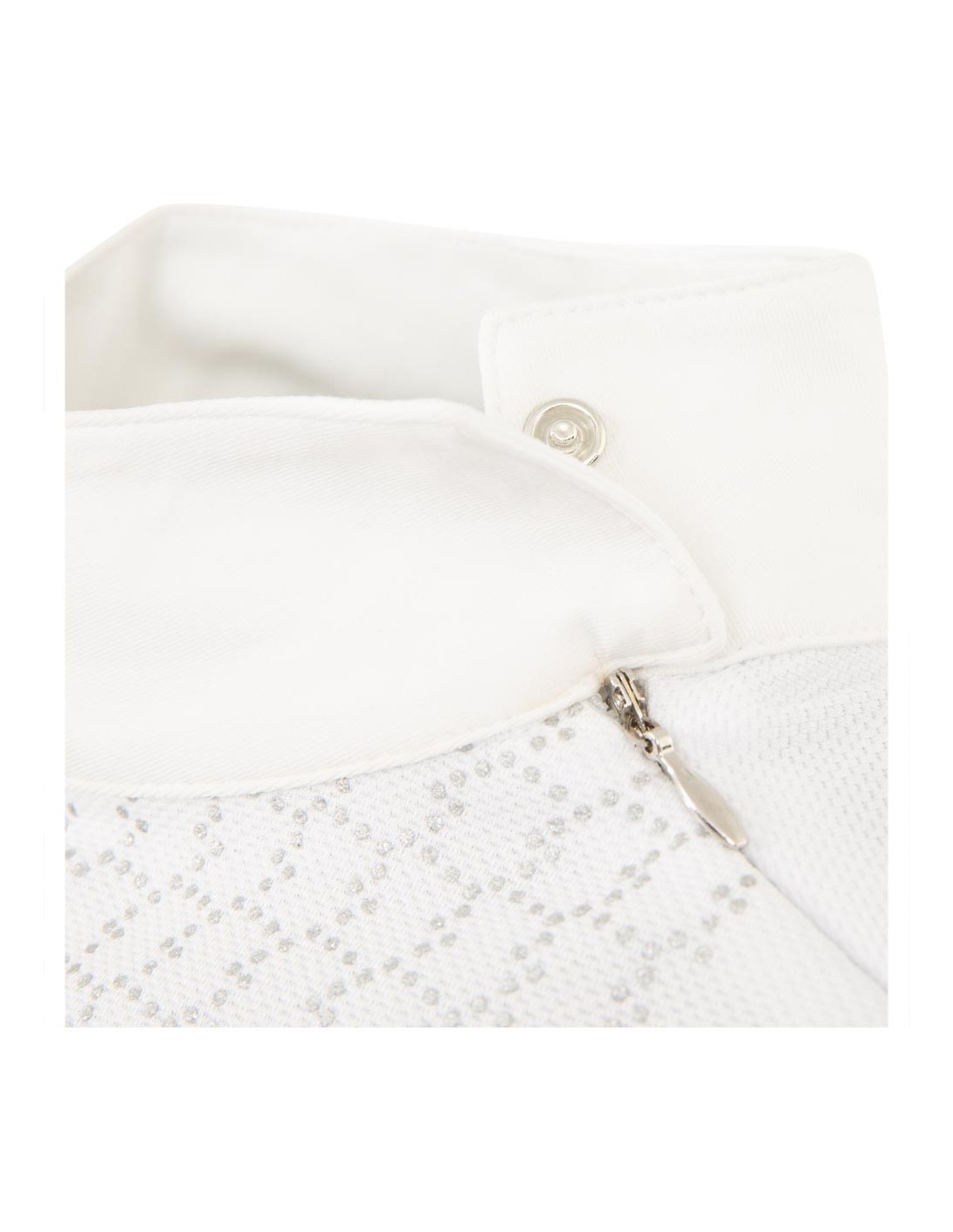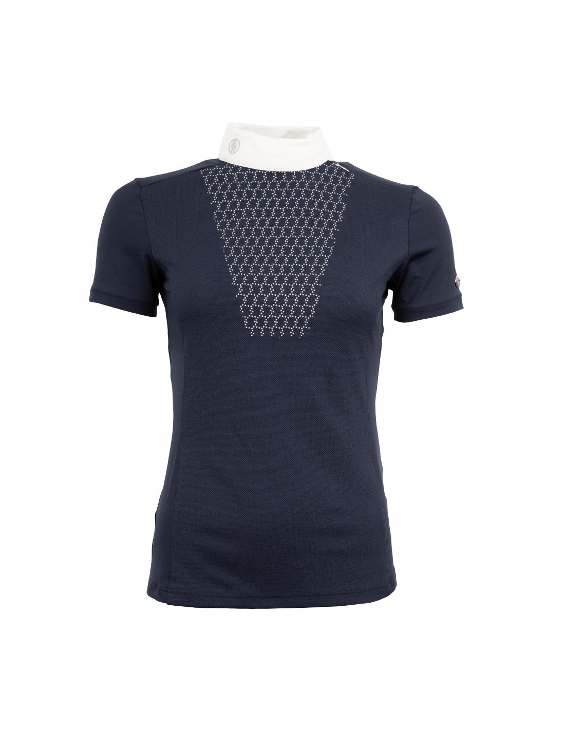 The shirt features a collar with two blind push buttons and a blind zipper from the collar to the shoulder. The silver, shiny pattern at the front and the silver BR logo’s, complete the elegant look of this shirt.