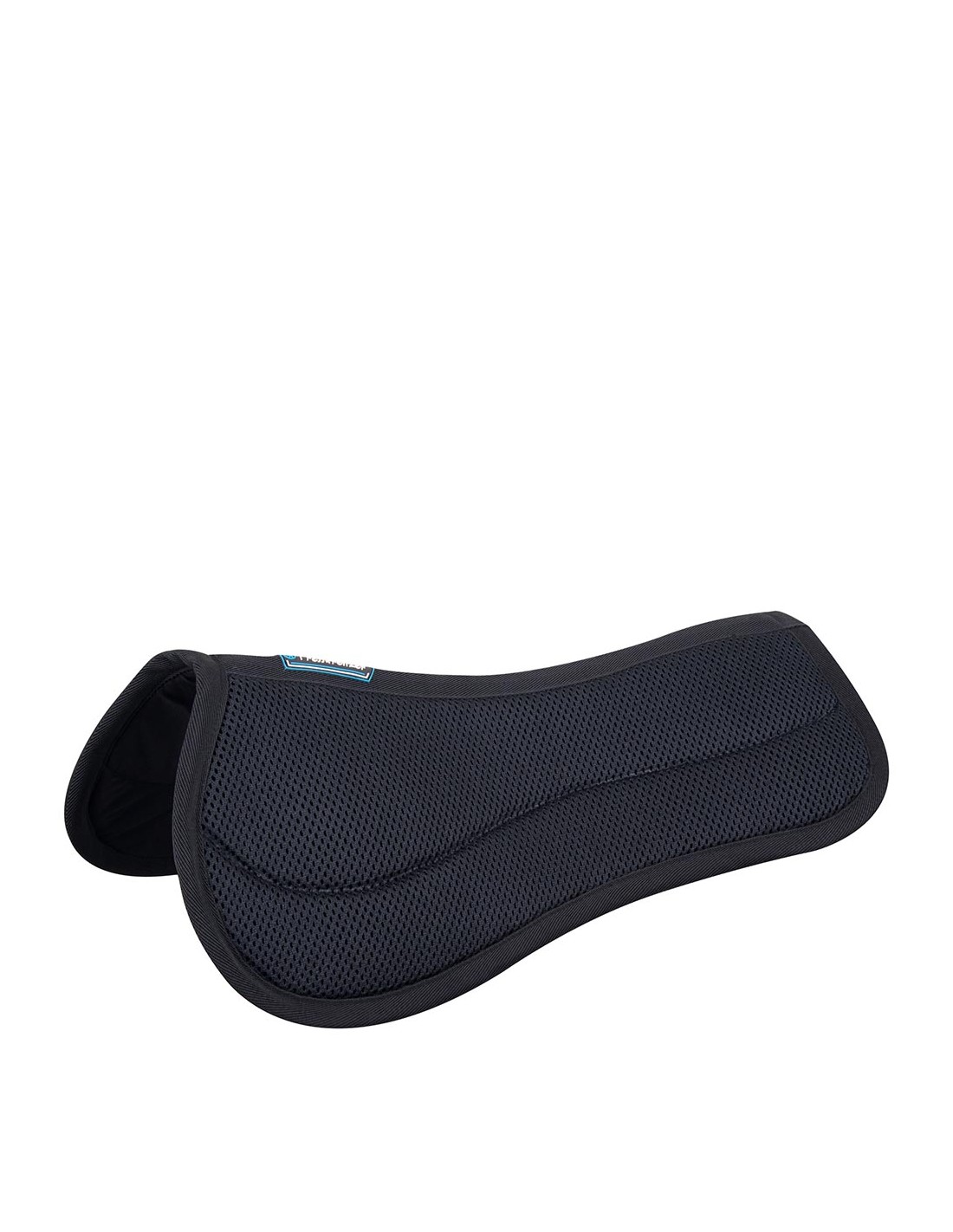 Cet amortisseur en forme anatomique est fait en fibres de polyester, qui sont tissées en trois dimensions. Ce matériau innovant et très léger est utilisé aussi dans le domaine de la technologie spatiale et aérospatiale. La structure de fibres unique aide à répartir le poids de la selle et du cavalier uniformément sur le dos de cheval. Cela réduit le risque de pression sur les vertèbres dorsales et sur le garrot. La doublure flexible en polyester tricoté suit les mouvements de la structure de fibres sans effort. L’amortisseur permet une répartition équilibrée du poids, une absorption des chocs excellente et une ventilation optimale. L’amortisseur peut être utilisé sous toutes les types de selles. Cet amortisseur de selle doit être placé entre le tapis de selle et la selle. Lavable en machine à 30°C.