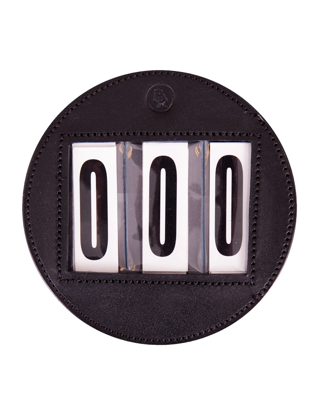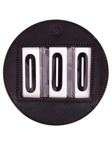 Numéro de départ avec housse ronde en cuir, se fixe facilement au bridon par deux fermetures velcro. Peut également être fixé au tapis de selle par une épingle de sûreté large. Les chiffres sont bien lisibles et réglable de 000 à 999. La housse de luxe a un diamètre de 11 cm.