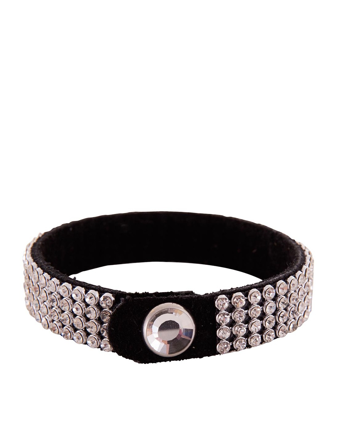 Bracelet en cuir élégant et entièrement décoré de quatre rangées de diamants d'imitation, comme un frontal! Ce bracelet souple est confortable à porter et se ferme par un grand bouton-pression Rhinestone (diamant d'imitation).