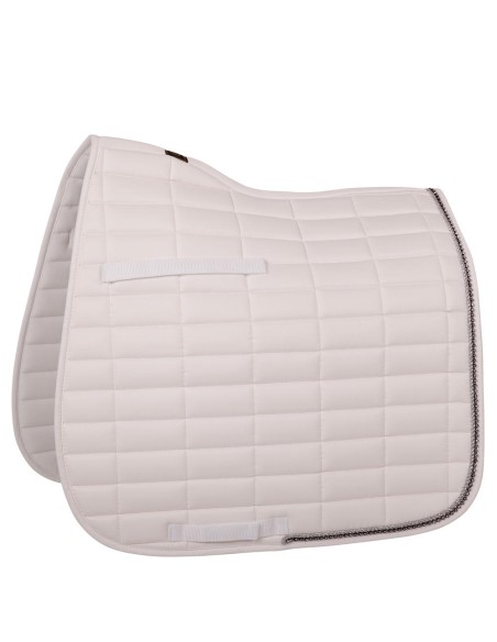Tapis de selle chic et préformé en coton polyester avec une doublure polyester Airflow. Le tapis de selle est pourvu d'un rembourrage de 300 g de polyfill et 10 mm de mousse. Le tissu extérieur a un matelassage rectangulaire de 10 x 5 cm. Le tapis de selle est luxueusement fini avec une lisière argentée et des diamants d'imitation. Passants de selle et sangle avec Velcro.