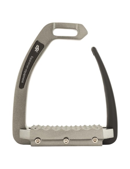 Le mécanisme de sécurité à charnière est en plastique qui se plie pour que le pied puisse être retiré de l’étrier. Le poids du cavalier permet de déclencher l'ouverture de l’étrier en cas de chute. De cette manière le pied ne reste pas coincé dans l’étrier. Dès que le pied quitte l’étrier, celui-ci se ferme automatiquement. La semelle est dotée d’un motif antidérapant afin que la saleté ne colle pas à l'étrier. La semelle d’étrier est légèrement inclinée, de sorte que le talon reste bien descendu. Le porte-étrivière biseauté assure une bonne position de l’étrier, de sorte que le pied soit en bonne position. Cela donne plus de stabilité au cavalier et améliore la position de la jambe.