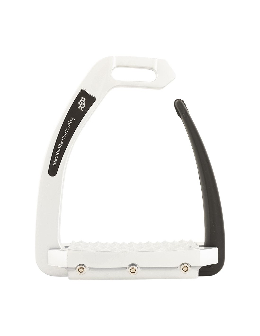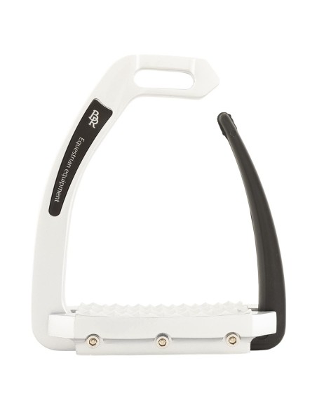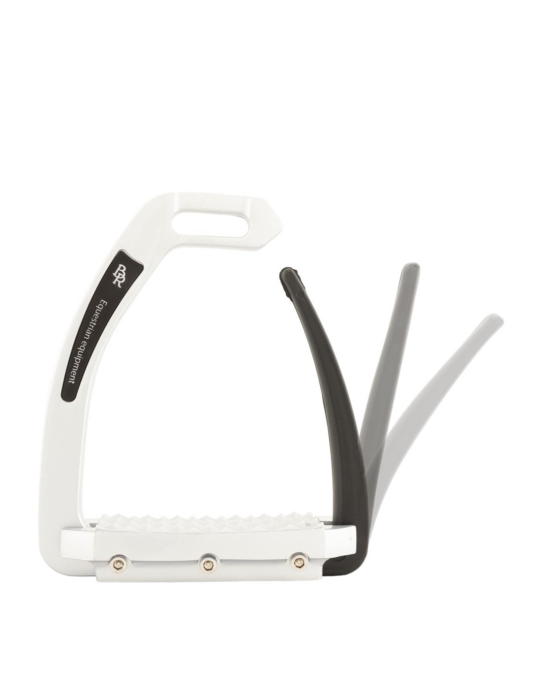 Le mécanisme de sécurité à charnière est en plastique qui se plie pour que le pied puisse être retiré de l’étrier. Le poids du cavalier permet de déclencher l'ouverture de l’étrier en cas de chute. De cette manière le pied ne reste pas coincé dans l’étrier. Dès que le pied quitte l’étrier, celui-ci se ferme automatiquement. La semelle est dotée d’un motif antidérapant afin que la saleté ne colle pas à l'étrier. La semelle d’étrier est légèrement inclinée, de sorte que le talon reste bien descendu. Le porte-étrivière biseauté assure une bonne position de l’étrier, de sorte que le pied soit en bonne position. Cela donne plus de stabilité au cavalier et améliore la position de la jambe.