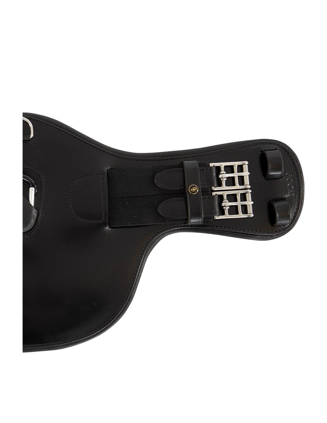 Cette sangle anatomique en cuir avec bavette est coute et pourvue d’extrémités élastiques de chaque côté, d’un anneau en forme de D central et d’un mousqueton pompier pour la fixation éventuelle des enrênements.