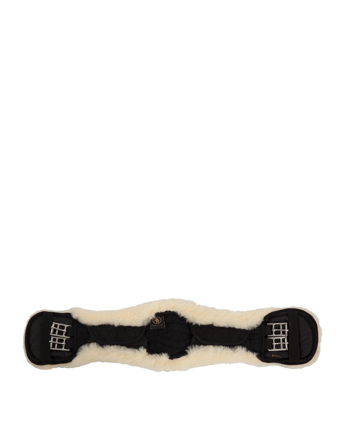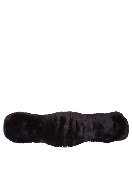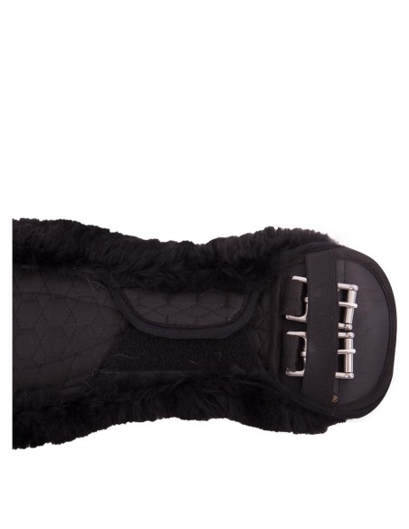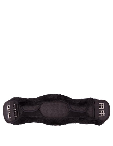 Cette sangle de dressage de forme anatomique en poly coton matelassé a une doublure douce en peau de mouton véritable. Cette doublure confortable permet de répartir et de diminuer la pression de la sangle et évite les lésions par pression et la surchauffe. Les peaux de mouton au tannage médical sont hygiéniques, résistantes à la transpiration et ne constituent pas un milieu de culture pour les bactéries. Convient particulièrement pour les chevaux à la peau sensible. La doublure est complètement amovible grâce à quatre fermetures velcro robustes et des bandes élastiques des deux côtés. La doublure peut être ainsi lavée séparément de la sangle. La sangle est pourvue de boucles à rouleaux en inox avec élastique sur un côté, le cheval peut être ainsi sanglé plus facilement. La selle reste également à sa place bien droite sur le cheval. La sangle est pourvue de deux anneaux en forme de D au milieu pour fixer des enrênements. La conception anatomique de la sangle donne au cheval une liberté de mouvement optimale.