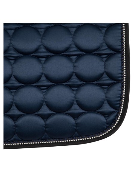 L'extérieur du tapis de selle est en satin de polyester et présente un piquage circulaire. Le bord est fini par un galon bicolore, une rangée de pierres noires à effet scintillant et un galon contrastant.
