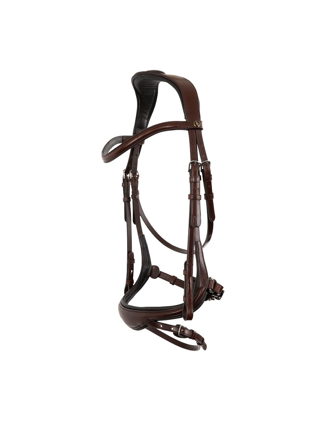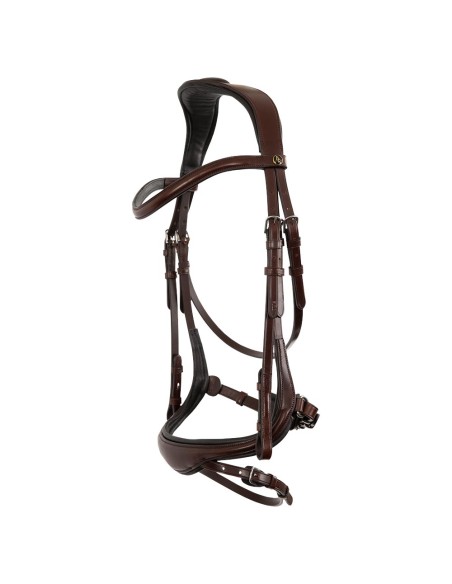 Ce bridon de forme anatomique se distingue par sa muserolle en forme de U et sa têtière large et souple.