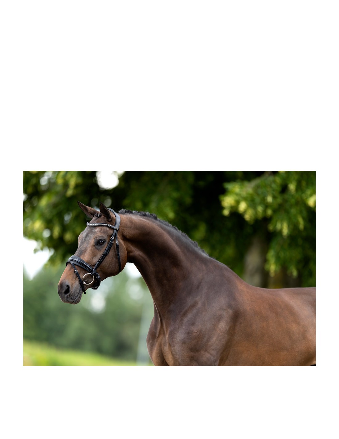 La bride est dotée de la têtière anatomique et extra douce Anatomic Fit (art. 189048) qui offre non seulement de la liberté aux oreilles, mais est également très douce pour soulager la pression sur les terminaisons nerveuses sensibles de la tête du cheval. La muserolle combinée est également merveilleusement rembourrée et de forme anatomique. La muserolle mesure 35 mm de large aux extrémités et 55 mm au milieu. Le cuir souple de très bonne qualité reste longtemps beau et épouse parfaitement la tête du cheval. Le frontal est incrusté d'une chaîne de luxueux cristaux Stellux™. Les cristaux Stellux ™ sont complètement serrés, ce qui les rend plus sûrs.