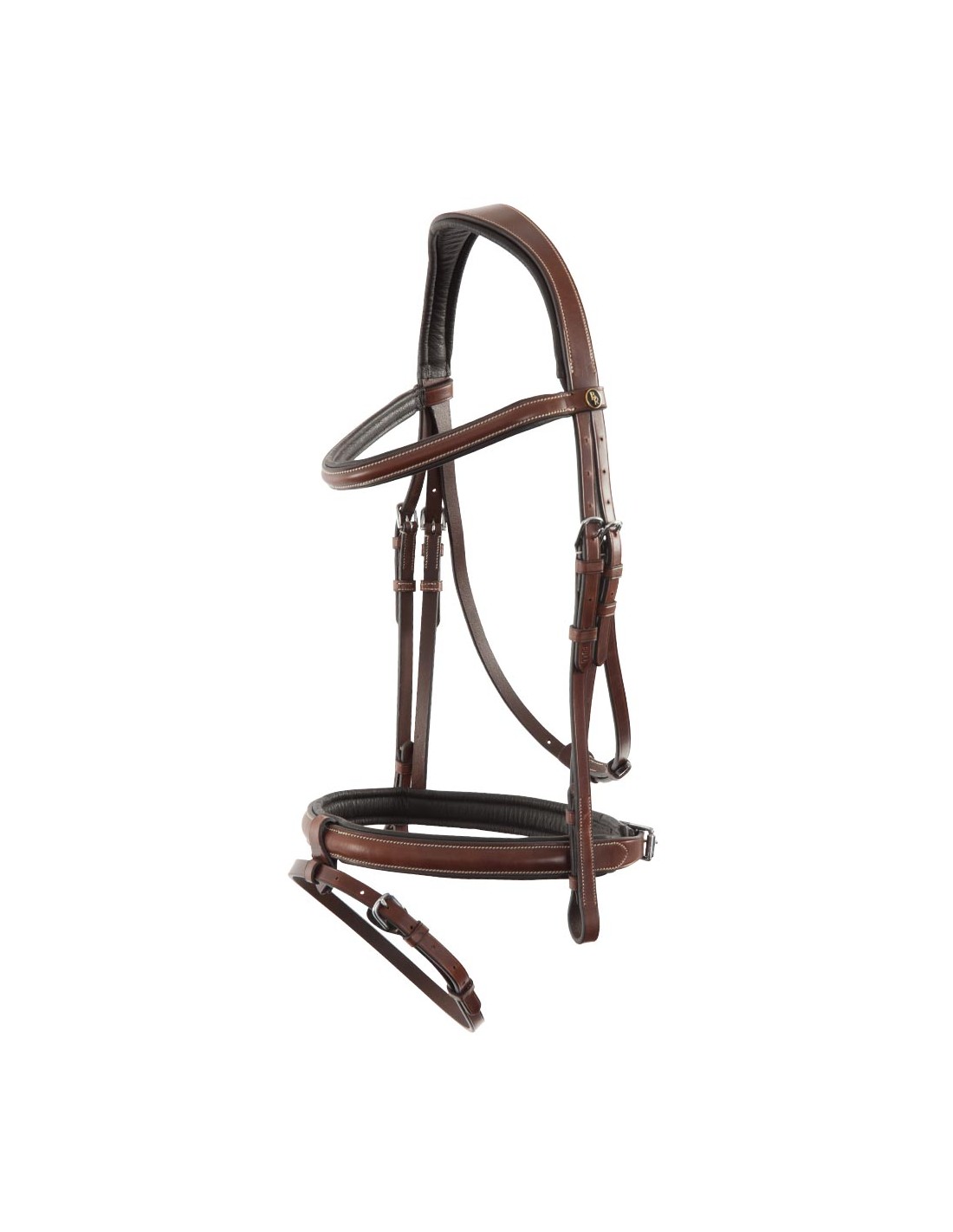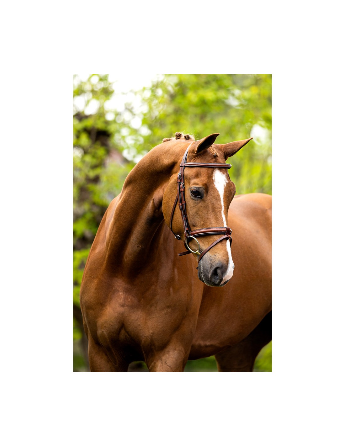 Bridon symétrique en cuir européen de qualité supérieure avec têtière en forme de E. La têtière anatomique est rembourrée et sa forme arrondie permet une plus grande liberté derrière les oreilles du cheval. Le frontal droit est bombé, rembourré et fini élégamment par une surpiqûre contrastée. La sous-gorge comprend une boucle de réglage en bas. La boucle comprend un rabat de protection supplémentaire. Les montants sont pourvus de fermetures à crochets. Le bridon est pourvu d’une muserolle combinée (2,7 cm environ) enjolivée par une surpiqûre contrastée. La muserolle est bombée et rembourrée. La sangle combinée et les boucles sont amovibles. Le bridon est ainsi facilement adaptable comme modèle à muserolle simple. La boucle comprend un rabat de protection supplémentaire. La bouclerie du bridon est en laiton chromé avec un bel éclat argenté. Rênes non fournies.