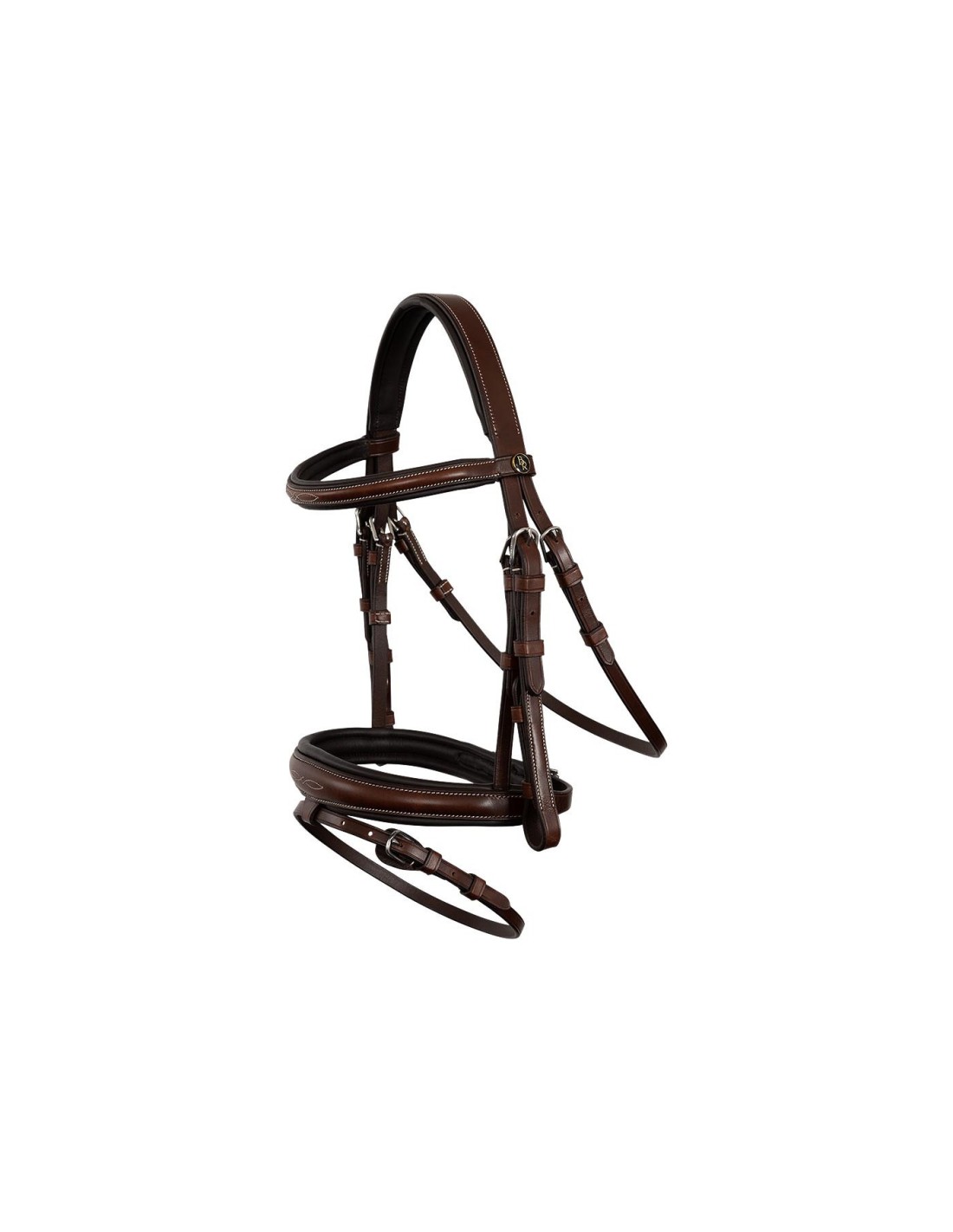 La muserolle combinée est merveilleusement rembourrée pour un confort optimal et est équipée d'une lanière avec un rabat de protection à la boucle. Les montants ont des fermetures dissimulées pour un confort optimal. Les surpiqûres décoratives de couleur crème donnent à la bride un aspect ludique.