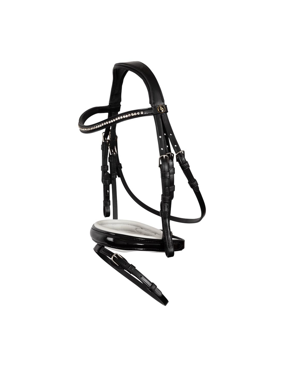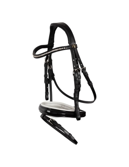 Cette bride se distingue par les diamants imitation Stellux™ brillants qui sont fermement ancrés dans le frontal légèrement incurvée afin qu'ils ne puissent pas simplement tomber. De plus, la muserolle combiné avec du cuir verni offre une brillance supplémentaire. La muserolle est équipé d'une lanière avec rabat de protection au niveau de la boucle.