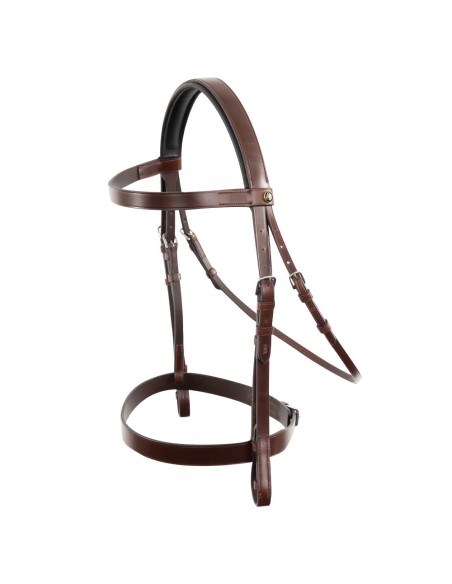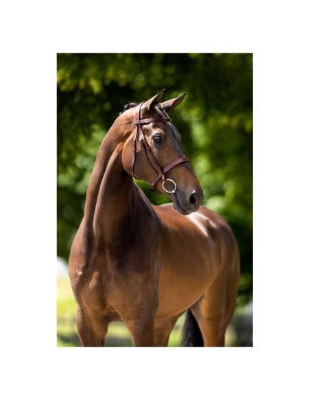 Il est réalisé en cuir européen souple et la têtière a un rembourrage doux en mousse de 5 mm d’épaisseur. La sous-gorge est réglable des deux côtés et les montants sont pourvus de fermetures invisibles. La muserolle et le frontal, qui ont la même finition, complètent ce bridon élégant.