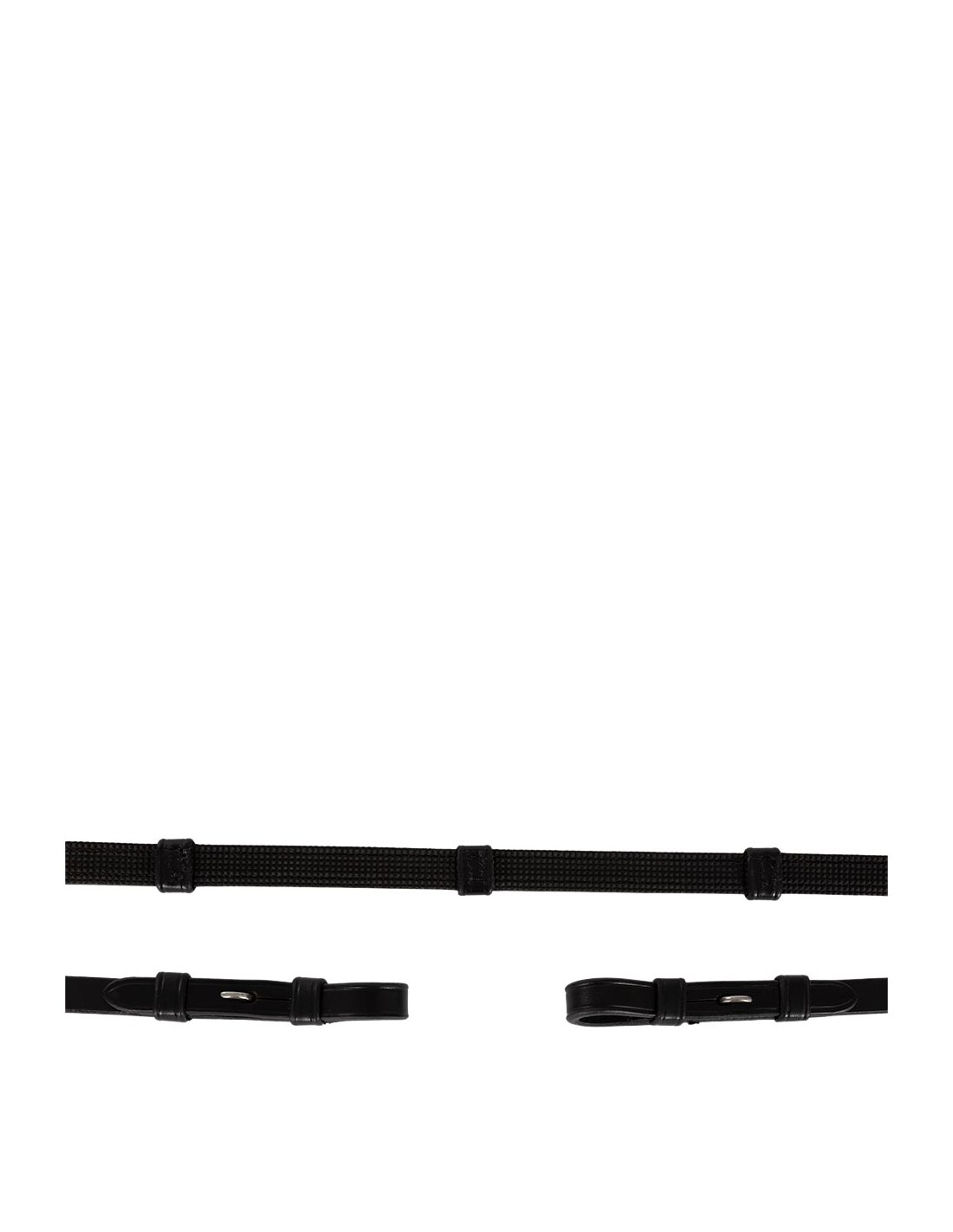 Ces rênes en caoutchouc et cuir sont fabriquées en cuir de haute qualité, robuste et reste belle pendant une longue période. L’intérieur est recouvert d’un motif antidérapant en caoutchouc robuste. De plus, la rêne est équipée de cinq arrêtoirs en cuir de chaque côté et de fermetures dissimulées aux extrémités. Largeur : 13 mm (4/8").