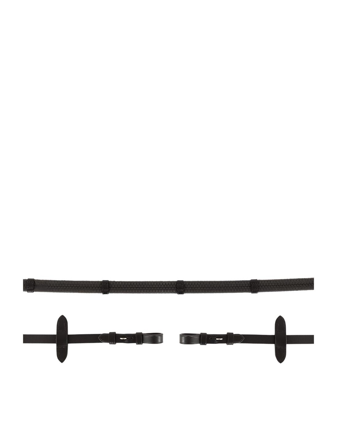 Cette rêne robuste Eventa Pro Grip est fabriquée en caoutchouc avec un insert en nylon. Le motif pratique sur le caoutchouc assure une adhérence optimale. La rêne est finie avec du cuir européen de haute qualité pour un renforcement supplémentaire. La rêne est équipée d'arrêts de main en cuir, de cinq arrêtoirs en cuir, de fermetures dissimulées et d'élégantes boucles rondes. Largeur : 16 mm.