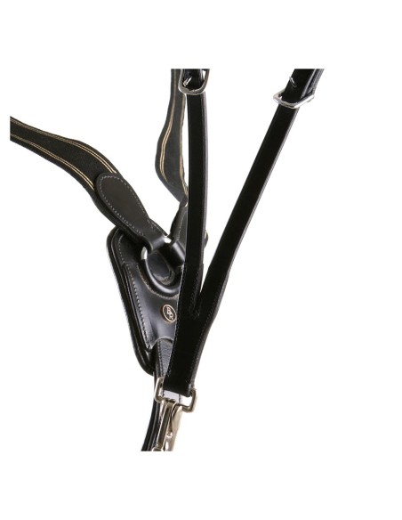 Collier de chasse en cuir avec élastique et une martingale en cuir. Le collier de chasse a plusieurs possibilités de réglage et est facilement fixable à la sangle avec un mousqueton. La martingale est également amovible par des mousquetons. Le collier de chasse, en cuir Européen de meilleur qualité, est solide, souple, de sensation douce et durable. La plupart des pièces sont rembourrées et pourvues de fournitures inoxydables de haute qualité. Le collier de chasse prévient que la selle avance, surtout à l'obstacle ou pour des chevaux très ronds ou les selles glissent facilement. La martingale fixée prévient que le cheval peut remonter la tête trop haut.