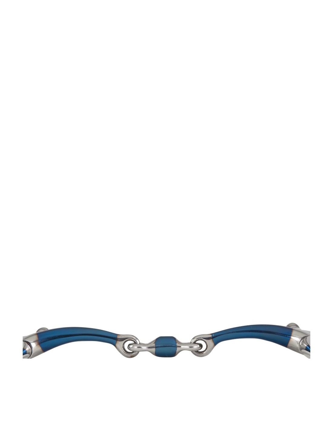 Filet à aiguilles double brisure présente les rondelles en inox massif et un embouchure en fer doux avec une couche (« sweet iron ») (bleu). Le revêtement de fer doux sur l’embouchure stimulera la salivation. Quand ce matériel réagit avec l'humidité, la chaleur et l'air dans un processus d'oxydation, la rouille superficielle a un gout sucré. Cela favorise l’acceptation du mors. Finalement la couleur bleue disparaît, mais le goût de la rouille de surface reste.