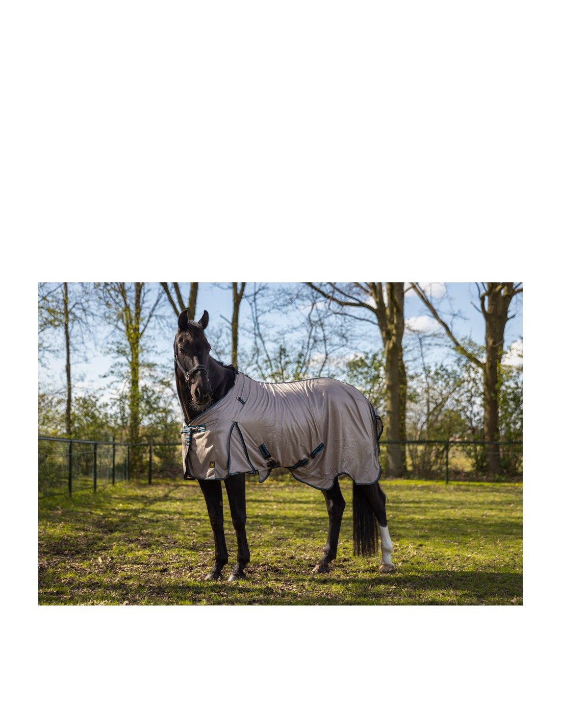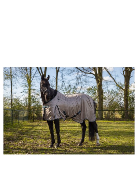 Cette chemise anti-mouches est faite d'une maille de polyester souple de qualité. Ce matériau à mailles fines offre une excellente protection contre les mouches et autres insectes. Au niveau de la poitrine, la couverture est renforcée par une couche supplémentaire de maille polyester et au niveau de la crinière, la couverture a une doublure lisse en nylon 190T. La protection d'encolure amovible a deux fermetures Velcro sur le devant et trois sangles élastiques sur le dessus pour attacher un licol. La protection d'encolure peut être facilement attachée aux anneaux en forme de D de la couverture à l'aide de trois sangles élastiques avec boucle à ouverture rapide et Velcro. La sangle abdominale est renforcée grâce au patch PU en cuir synthétique. La couverture est équipée d'une fermeture de poitrail réglable avec un boucle à ouverture rapide et une large fermeture Velcro. En outre, la couverture a une passepoil sur la couture arrière et une protection du garrot. La couverture est aussi pourvue des plis d'aisance ; des fermetures de poitrail réglables et amovibles avec élastique et des courroies de cuisses élastiques, réglables et amovibles. La ligne de fond formée assure une protection optimale de l'abdomen. Le large rabat de queue a un passant pour la queue et une courroie de queue. La couverture est équipée du bouclerie en zinc avec une finition mate et argentée. Lavable en machine à 30°C.