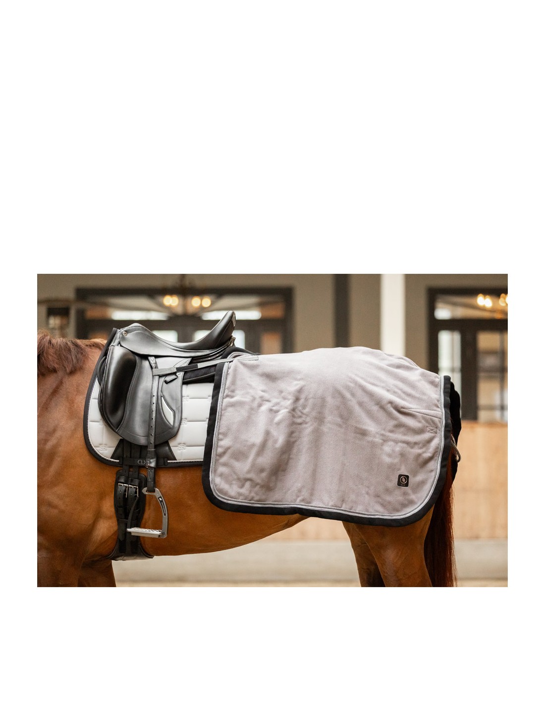 Le couvre-reins a une couture arrière à double couture et est formée à l'endroit où le dos de la selle est placé. La couverture reste fermement sur le dos du cheval grâce aux solides passants de sangle avec velcro qui fixent la couverture à la selle et à la courroie de queue à l'arrière. La couverture est finie avec une belle garniture en corde et une garniture avec CLX.