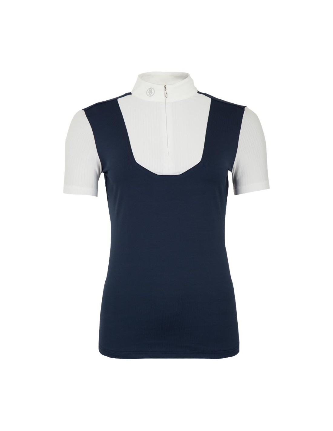 Polo de concours à séchage rapide, régulateur d’humidité avec un look classique élégant qui peut également très bien être porté pendant les jours de concours plus chauds. Le col se ferme avec une fermeture à glissière invisible et est agrémenté d’un logo BR argenté en silicone. Les manches et une partie de la poitrine sont réalisées en tissu contrastant avec une rayure raffinée. Le polo est agrémenté d’un badge métallique argenté sur la manche gauche. Le polo de concours est disponible en blanc ou en blanc avec une couleur contrastante bleue.