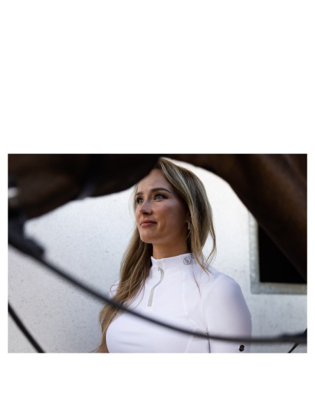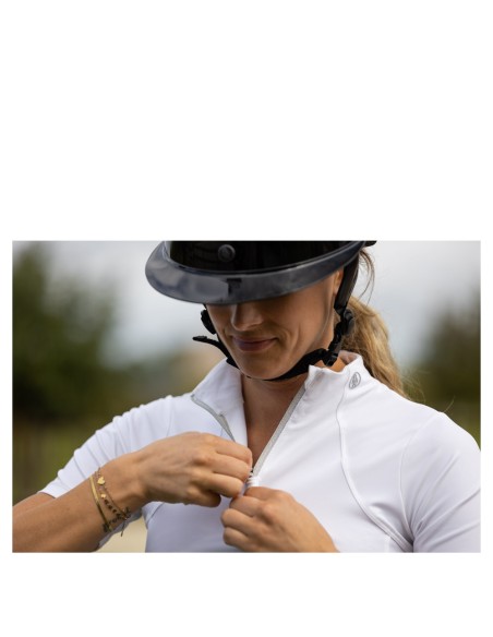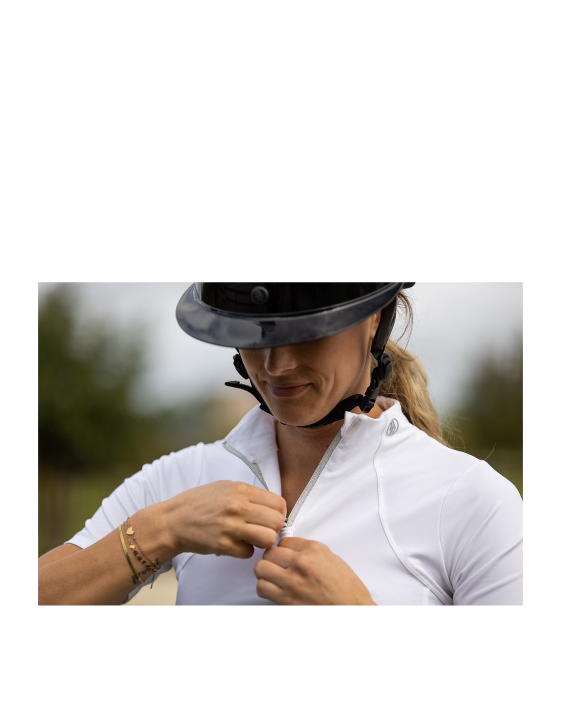 Cette élégante chemise de compétition se distingue par ses détails argentés tels que la fermeture éclair et le beau col montant. Le tissu régule l'humidité et sèche rapidement, ce qui permet un confort de port optimal. Parce que c'est une chemise stretch, la coupe est agréable et près du corps. La fermeture éclair est équipée d'un protège-glissière. Les coutures plates argentées et les logos BR sur la manche et le col complètent le chemise de compétition de manière élégante.