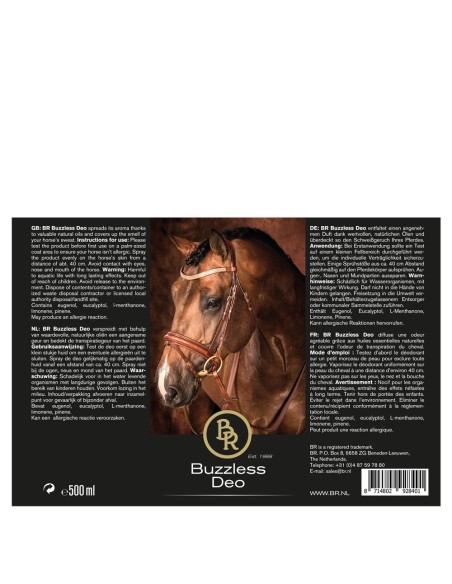 Le Buzzles Deo diffuse une odeur agréable grâce aux huiles essentielles naturelles et couvre l’odeur de transpiration du cheval. Contenu : 500 ml