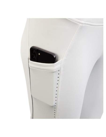 Le tissu robuste et durable reste beau pendant longtemps pour que vous puissiez en profiter longtemps. Les poches latérales profondes des deux côtés conviennent pour ranger un téléphone portable. Les strass et le subtil galon métallisé donnent à ces collants de compétition une touche chic. Le fond en silicone sur le siège offre une adhérence supplémentaire et un siège stable.