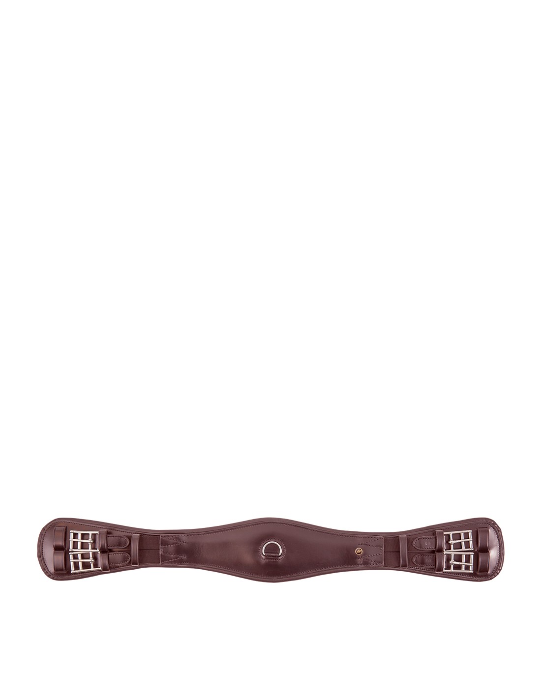 Sangle de dressage anatomique en cuir avec des extrémités élastiques de chaque côté et un anneaux en "D" pour la fixation d'enrênements. La sangle est pourvue de boucles à rouleaux inoxydables et de coutures décoratives.