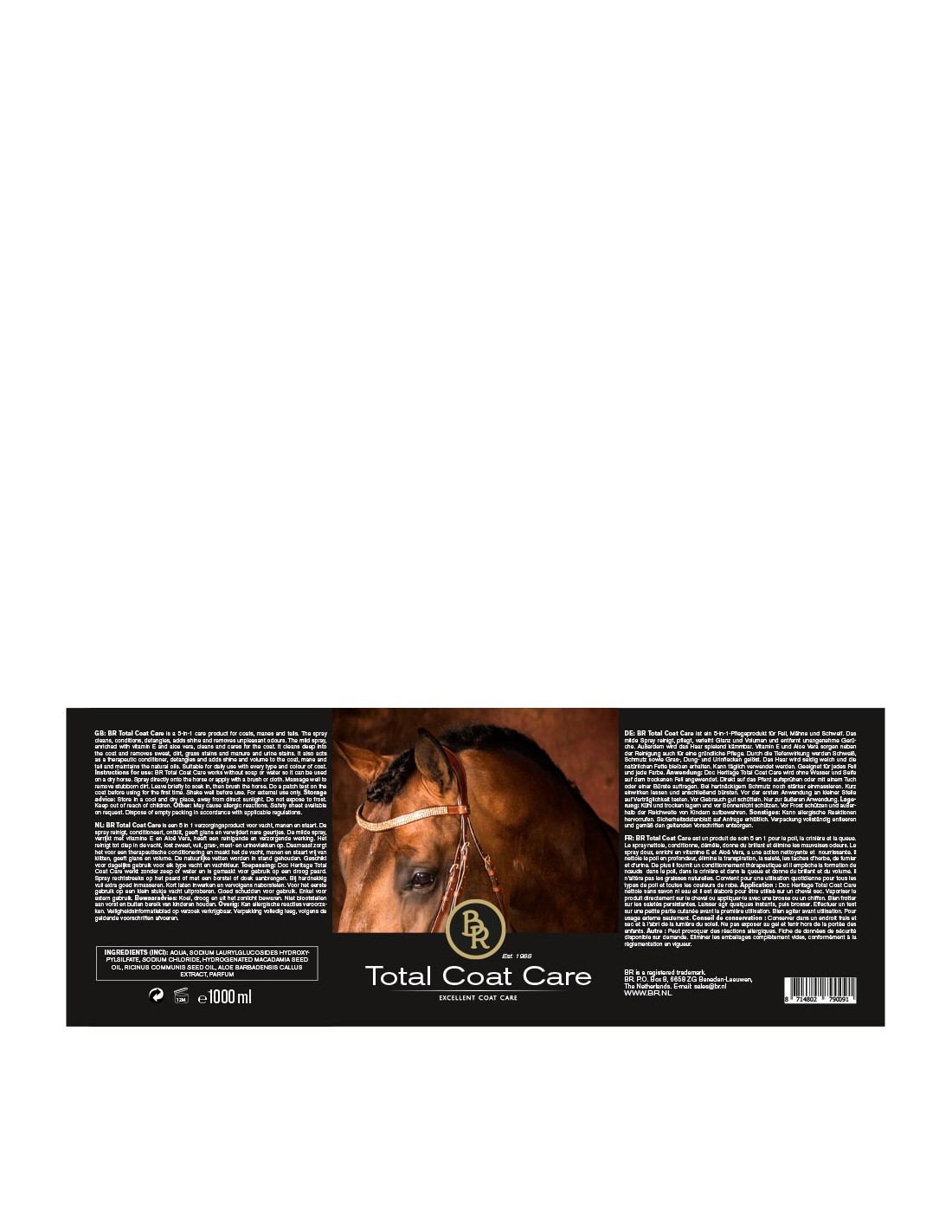 Application : BR Total Coat Care nettoie sans savon ni eau et il est élaboré pour être utilisé sur un cheval sec. Vaporiser le produit directement sur le cheval ou appliquer-le avec une brosse ou un chiffon. Bien frotter sur les saletés persistantes. Laisser agir quelques instants, puis brosser. Effectuer un test sur une petite partie cutanée avant la première utilisation. Bien agiter avant utilisation. Pour usage externe seulement. Contenance 1000 ml. UVC : 6.
