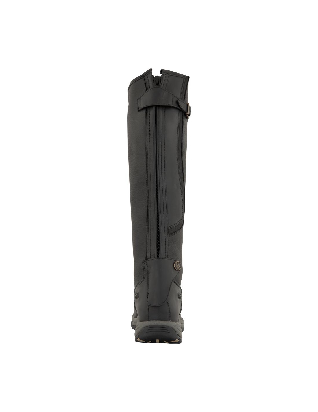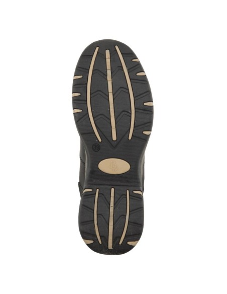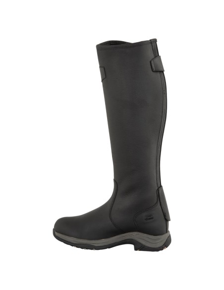 Cette botte déquitation robuste en cuir nubuck huilé est pourvue dune semelle à relief antidérapante en polyuréthane et caoutchouc. Le cuir huilé est déperlant et presque sans entretien. La botte est doublée avec de la laine synthétique. La première en polyuréthane avec mousse de gel absorbe les chocs et augmente le confort. La botte a une fermeture arrière à glissière YKK très forte, sécurisée par un bouton pression sur rabat en haut et au bas de la tige. De plus, la botte est équipée de deux taquets d'éperon. Linsert élastique au niveau du mollet et la sangle avec boucle réglable assurent un ajustement parfait et un beau look. La tige est en cuir grainé et le pied, le talon est les rabats sont en cuir lisse. La botte est très appropriée pour léquitation, mais également pour lusage dans lécurie et pour porter décontractée.