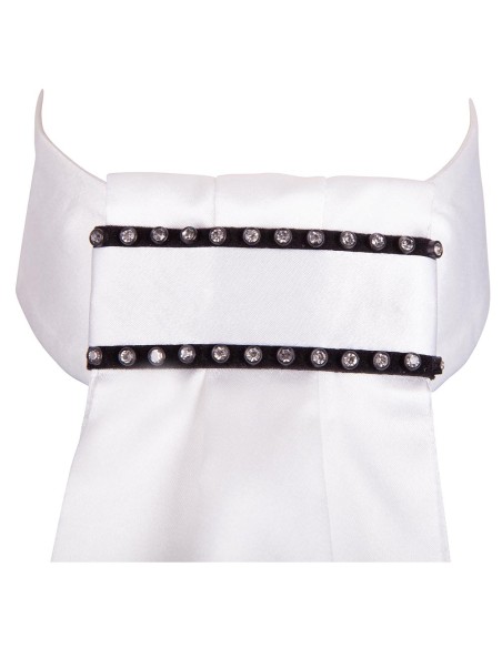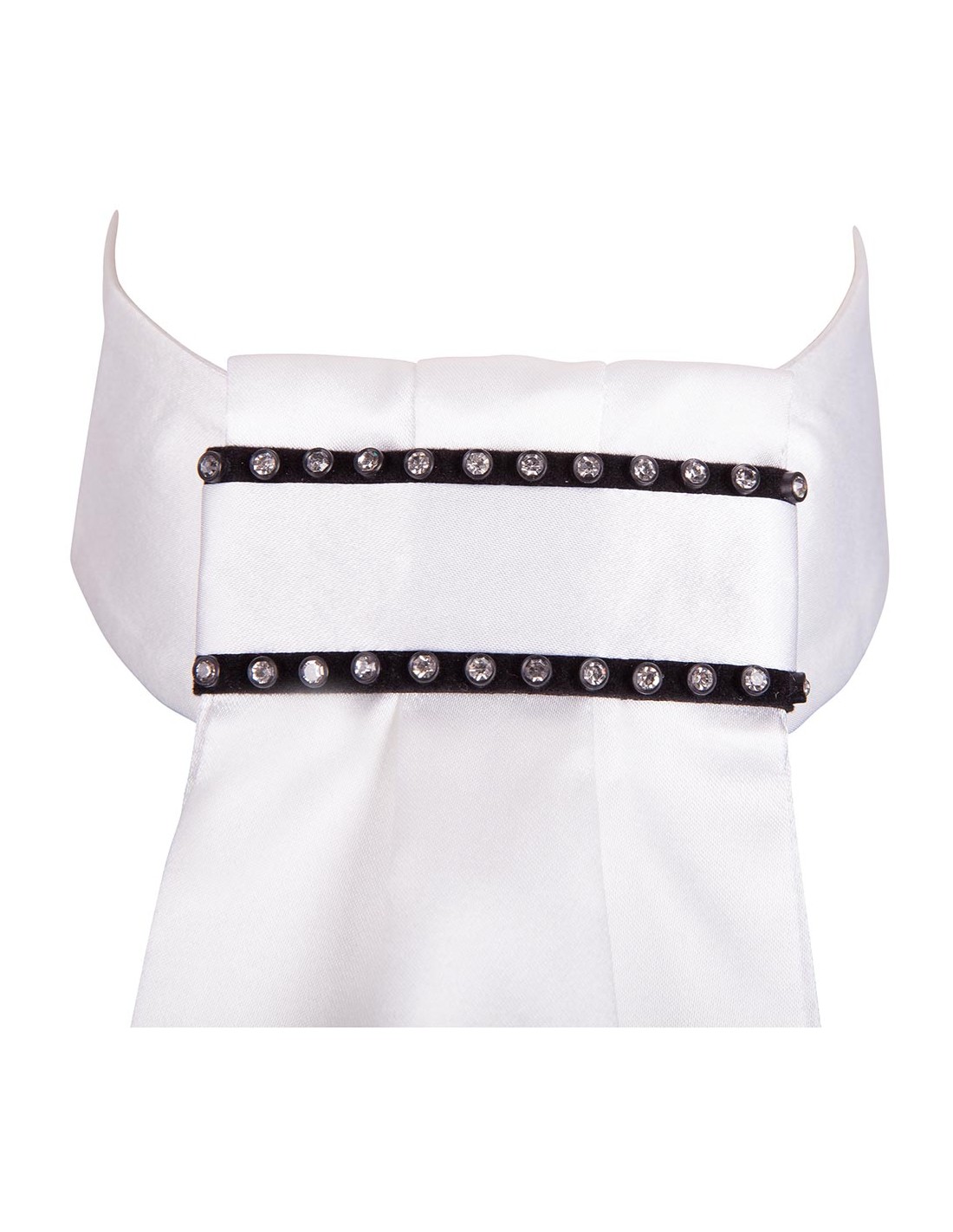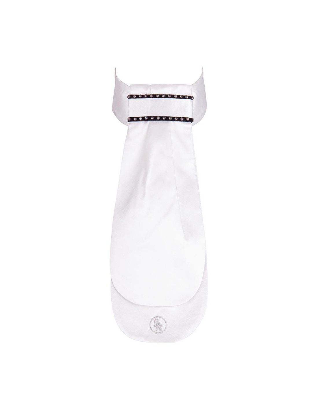Luxe plastron voor kinderen vervaardigd van een mooie kwaliteit glanzend satijn. De plastron heeft in het midden twee zwarte biezen met imitatie diamanten. De plastron is aan de onderkant voorzien van een met zilverkleurig draad geborduurd BR-logo. De plastron is uiterst praktisch in gebruik, hoeft niet te worden gevouwen en ook het gebruik van een plastronspeld is overbodig. De plastron is gemakkelijk om de boord van het wedstrijdshirt of de wedstrijdblouse te bevestigen door middel van de klittenbandsluiting aan de achterkant. Materiaal: 100% polyester satijn.