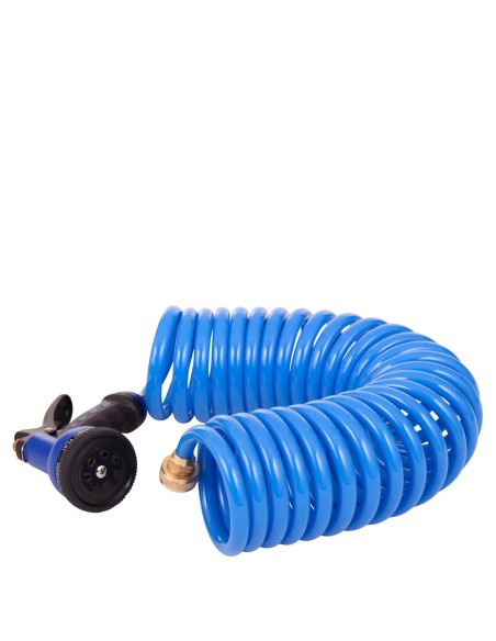 Deze waterslang is voorzien van een sproeikop met 6 sproeistanden, 7.5 m.