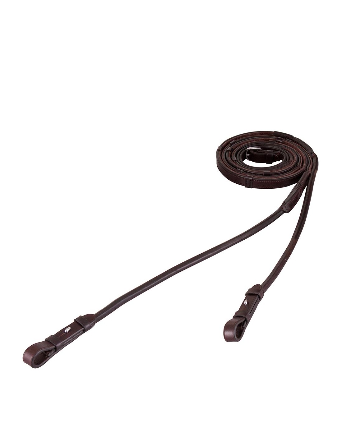 Lederen antislip teugel met rubberen binnenzijde, lederen handstops en blinde sluitingen, 16 mm. Zonder teugelstops. De uiteinden van de teugel zijn van rondgenaaid leder.