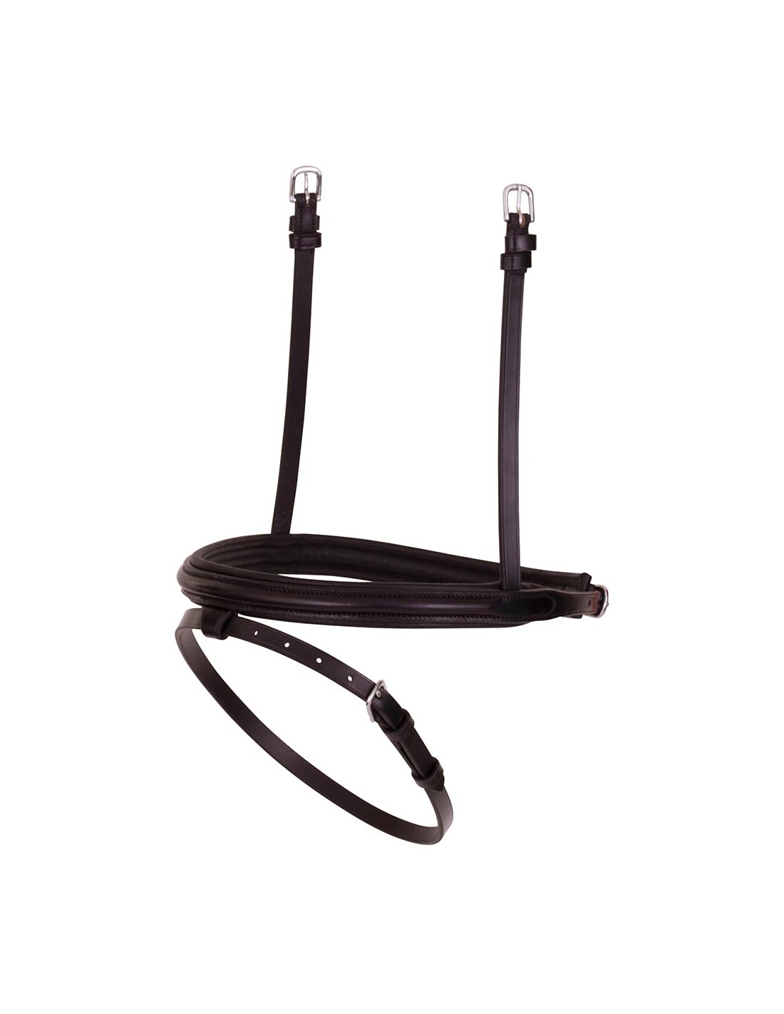 Gecombineerde, smalle neusriem, rond gebombeerd en zacht gevoerd. Geschikt voor hoofdstellen waarbij de riempjes van de neusriem met een gesp vastgezet worden aan het kopstuk, zoals bij de anatomische BR hoofdstellen. De neusriem heeft glanzende, zilverkleurige fournituren.