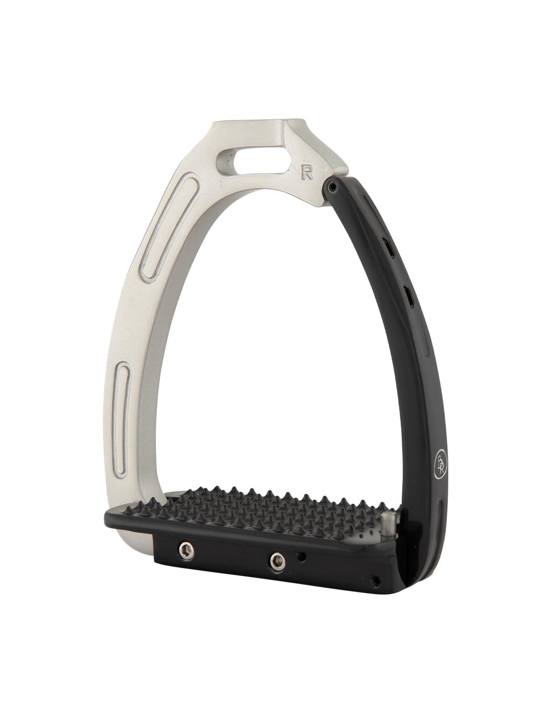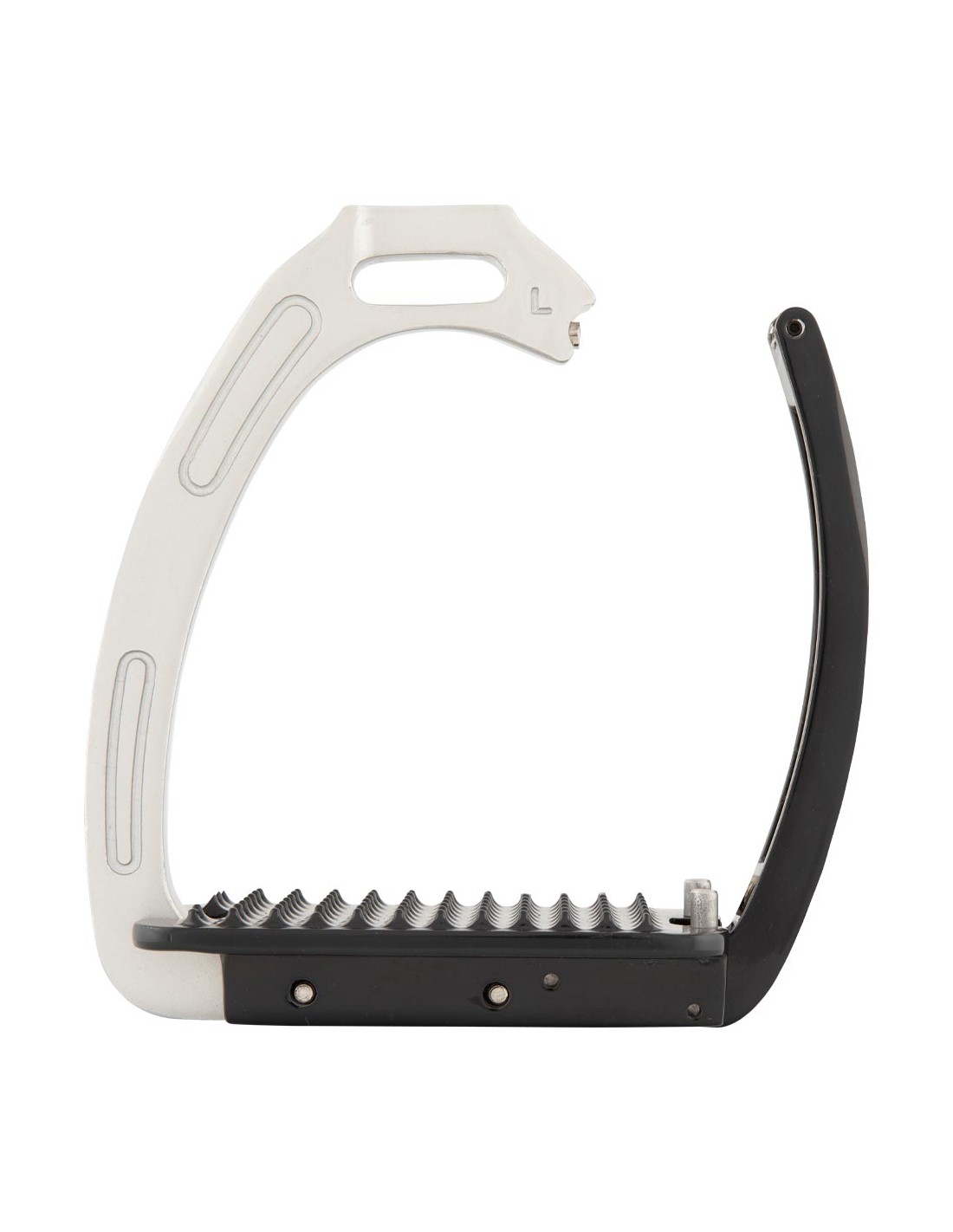 Deze stijgbeugel is gemaakt van gegalvaniseerd aluminium met een poedercoating en is aan de binnenkant versterkt met roestvrijstaal voor extra stevigheid. De beugel is uitgerust met een magnetisch veiligheidsmechanisme. Het gewicht van de ruiter zorgt ervoor dat de beugel opent bij een val. Op deze manier blijft de voet niet in de beugel hangen. Zodra de voet de beugel verlaat, sluit de beugel zich automatisch. De licht gebogen stijgbeugelriemophanging zorgt voor een goede beugelpositie, waardoor de voet in de juiste positie gehouden wordt. Dit geeft de ruiter meer stabiliteit en verbetert de beenligging.