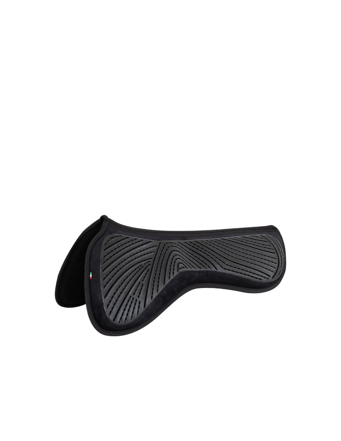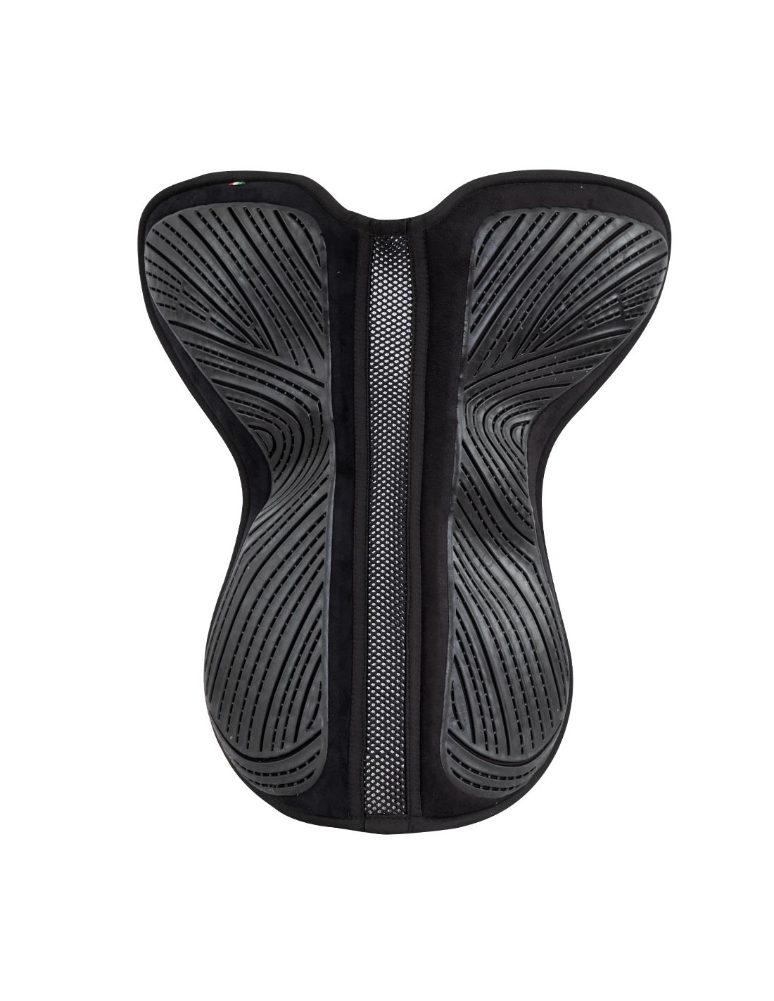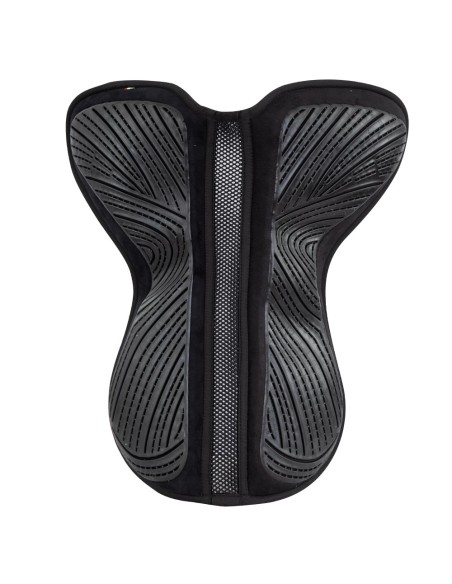 Het 3D Spacer materiaal draagt bij aan een perfecte drukverdeling en voorkomt warmteophopingen. Daarnaast zorgt het voor een uitmuntende luchtdoorlatendheid en vochtabsorptie. De Memory Foam absorbeert schokken, voorkomt wrijving en zorgt voor een gelijkmatige drukverdeling. In combinatie met de therapeutische gel biedt het een uniek comfort aan de paardenrug, maar zorgt het ook voor een optimale ligging van de pad onder het zadel door het hechtende effect van het geloppervlak. De speciale vorm van de pad zorgt voor ontlasting van het schoftgebied.