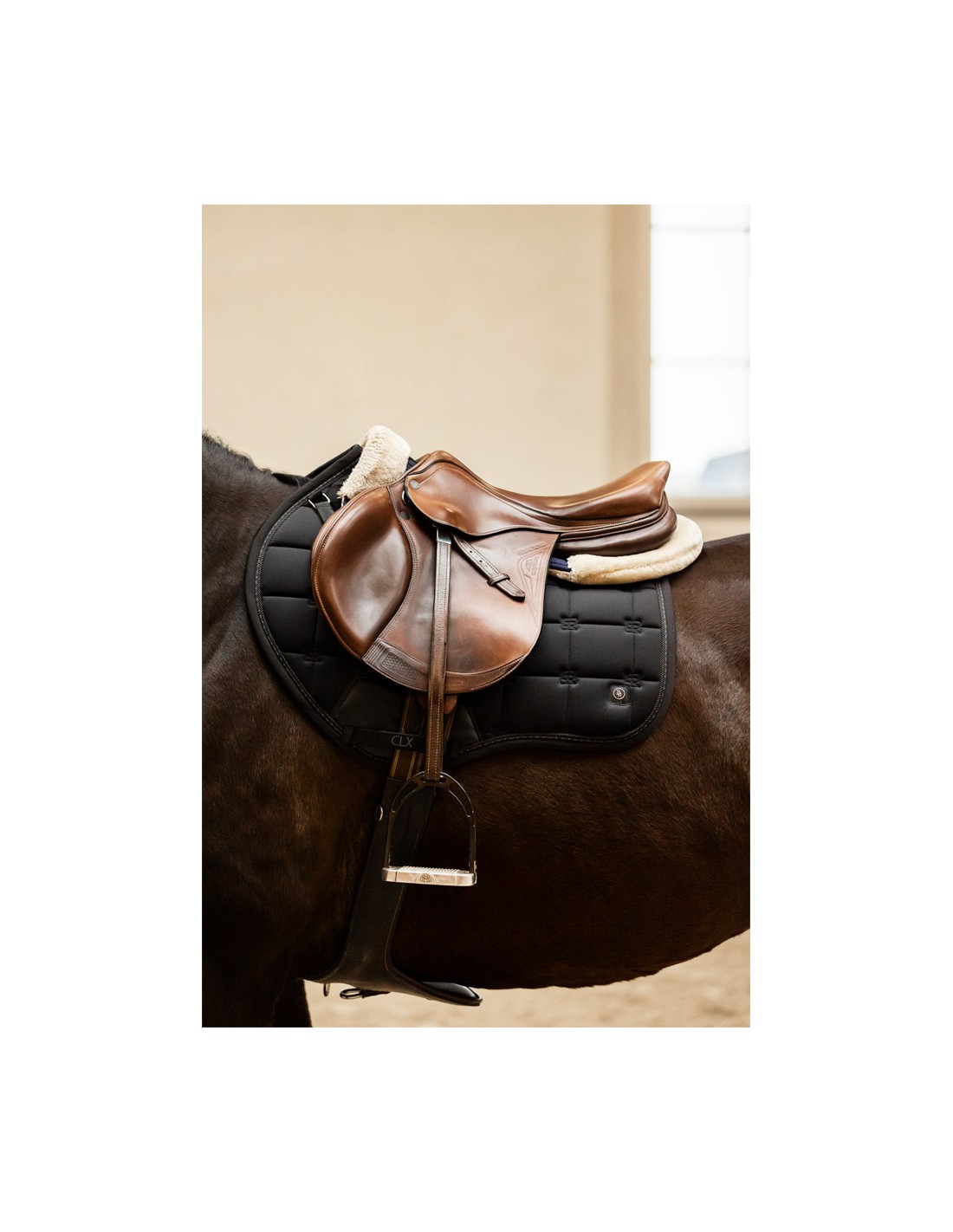 Het stijlvolle CLX zadeldek is vierkant gestept met BR logostiksels voor een unieke look en afgewerkt met twee subtiele biezen. Het zadeldek is uitgevoerd met verstelbare zadel- en singellussen met klittenband en een extra versteviging van synthetisch leder bij de singellus.