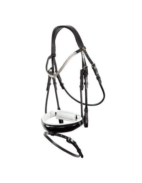 Dit symmetrische hoofdstel van hoogwaardig Europees leder heeft een E-Line kopstuk. Dit anatomisch gevormde kopstuk is zacht gevoerd en zorgt dankzij zijn ronde vorm voor extra vrijheid achter de oren van het paard. Het frondeel is voorzien van twee rijen grote Oostenrijkse kristallen en onderlegd met zacht leder. De keelriem is aan beide zijden verstelbaar. Zowel de keelriem als de bakstukken zijn vervaardigd van rondgenaaid leder. De bakstukken zijn voorzien van blinde sluitingen. Het hoofdstel heeft een brede, gecombineerde aansnoerneusriem (circa 4 cm) met lakleder. De neusriem is rond gebombeerd, zacht gevoerd en voorzien van een brede, zacht gevoerde kaakbeschermer. Dankzij de anatomische vorm wordt meer ruimte gecreëerd voor de bitringen. Het hoofdstel heeft een V-vormige sperriemlus en de gesp van de sperriem heeft een extra beschermflap. Het hoofdstel is uitgerust met glanzende, zilverkleurige fournituren van verchroomd messing. Exclusief teugels.