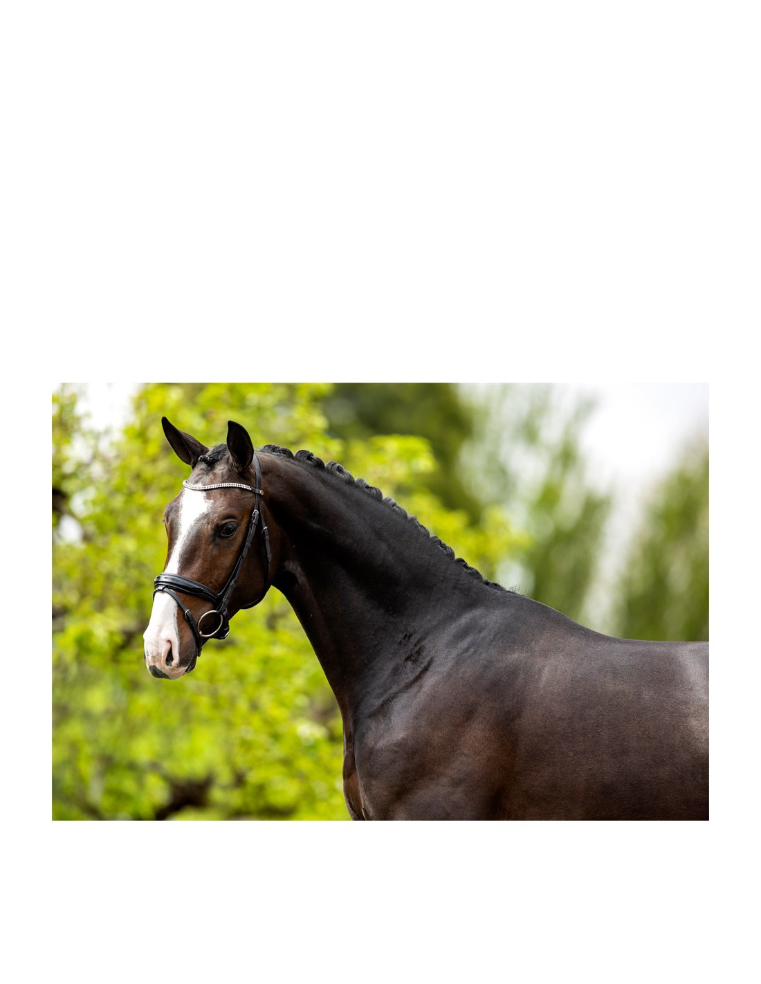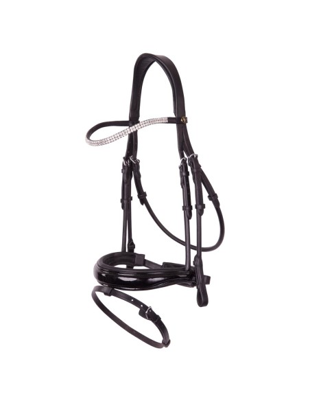 Dit symmetrische hoofdstel van hoogwaardig Europees leder heeft een E-Line kopstuk. Dit anatomisch gevormde kopstuk is zacht gevoerd en zorgt dankzij zijn ronde vorm voor extra vrijheid achter de oren van het paard. Het frondeel is voorzien van twee rijen grote Oostenrijkse kristallen en onderlegd met zacht leder. De keelriem is aan beide zijden verstelbaar. Zowel de keelriem als de bakstukken zijn vervaardigd van rondgenaaid leder. De bakstukken zijn voorzien van blinde sluitingen. Het hoofdstel heeft een brede, gecombineerde aansnoerneusriem (circa 4 cm) met lakleder. De neusriem is rond gebombeerd, zacht gevoerd en voorzien van een brede, zacht gevoerde kaakbeschermer. Dankzij de anatomische vorm wordt meer ruimte gecreëerd voor de bitringen. Het hoofdstel heeft een V-vormige sperriemlus en de gesp van de sperriem heeft een extra beschermflap. Het hoofdstel is uitgerust met glanzende, zilverkleurige fournituren van verchroomd messing. Exclusief teugels.
