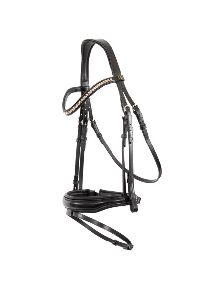 Het kopstuk en de aansnoerneusriem zijn beiden zacht onderlegd voor optimaal comfort en anatomisch gevormd voor een goede drukverdeling en pasvorm. Het frondeel is ingelegd met een ketting van luxe roségouden Stellux™-kristallen. De Stellux™-kristallen zitten helemaal omklemd, waardoor ze extra stevig vastzitten.