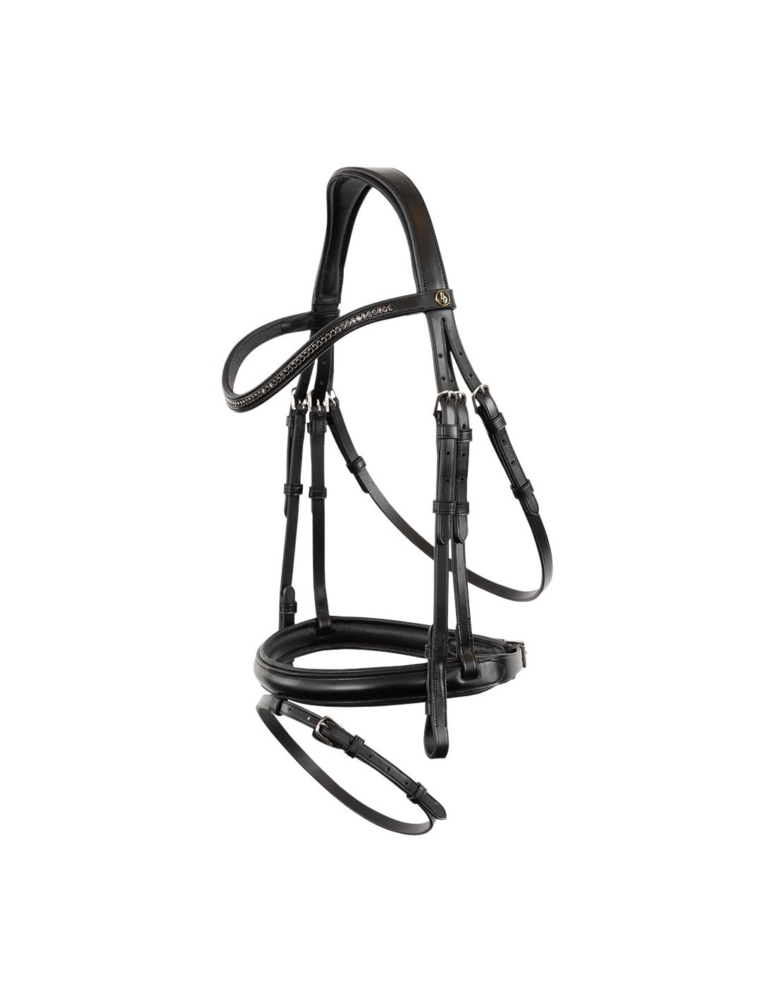 Het mooie licht gebogen frondeel met zwarte, glanzende Stellux™-steentjes geeft het hoofdstel een elegante uitstraling. Het hoofdstel sluit dankzij het soepele leder mooi aan op het paardenhoofd. Daarnaast bevat het hoofdstel stevige gespen met chroomfinish en een sperriem met beschermflapje voor de gesp.