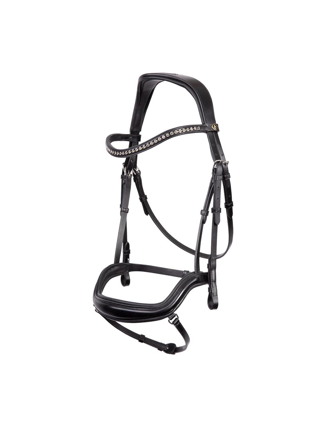 Het hoofdstel is gemaakt van soepel, zacht leder dat zich goed vormt naar paardenhoofd. Het leder is van goede kwaliteit en blijft lang mooi. Het licht gebogen BR frondeel Vosges is ingelegd met een ketting van luxe Stellux™ kristallen in de kleur Zwart-Black Diamond en onderlegd met leder. De kristallen zitten helemaal omklemd, waardoor ze extra stevig vastzitten. Het hoofdstel is afgewerkt met glanzende, zilverkleurige accenten van verchroomd messing.