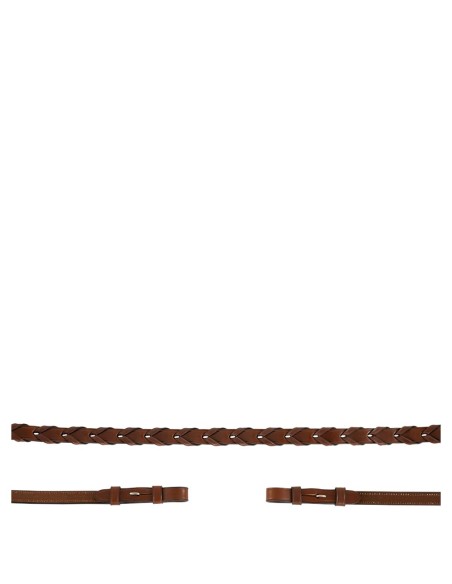 Deze lederen gevlochten teugels zijn uitermate geschikt voor Hunters. De teugeluiteinden zijn rond gebombeerd en verfraaid met crèmekleurig sierstiksel. Met blinde sluitingen, zonder teugelstops. De teugels zijn 16 mm breed. Passend bij het BR Hunter hoofdstel Oxford, artikel 185000.