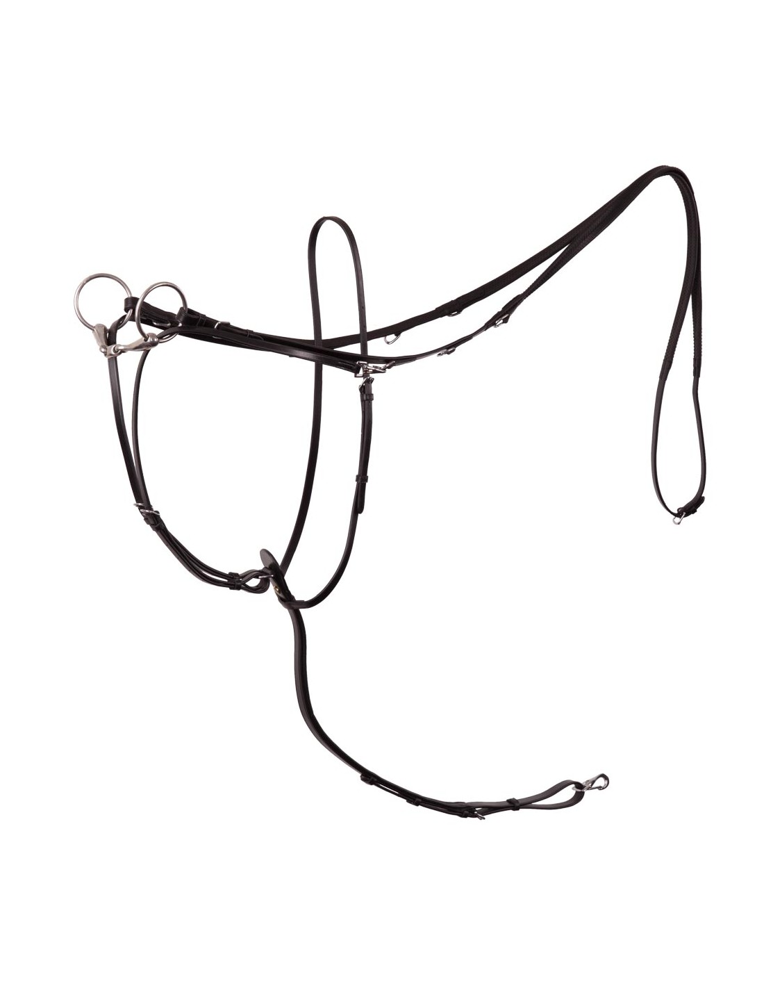 Lederen Thiedemann teugel met een verstelbare halsriem en een verstelbare singellus met een afneembare karabijnhaak voor bevestiging aan de singel. De smalle riemen van de martingaal zijn eveneens verstelbaar en voorzien van karabijnhaken. De rubberen teugel (21 mm breed) heeft lederen uiteinden (15 mm breed) met gespsluitingen. Deze teugel is aan beide zijden voorzien van drie D-ringen: twee op het lederen uiteinden en één op het rubberen gedeelte. De smalle martingaalriemen worden door de bitringen gehaald en met de karabijnhaken aan de D-ringen van de teugel bevestigd. De Thiedemann teugel is uitgerust met glanzende, zilverkleurige fournituren van verchroomd messing. De Thiedemann teugel zorgt ervoor dat het paard het hoofd niet te ver omhoog en/of naar voren kan brengen tijdens het rijden.