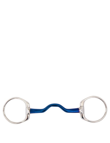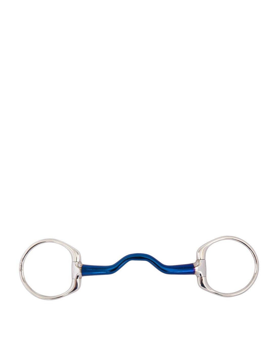 Deze ongebroken bustrens is vervaardigd van massief roestvrij stalen ringen en een zacht stalen mondstuk gecombineerd met een sweet iron laagje op het mondstuk (blauw). De sweet iron coating op het mondstuk stimuleert de aanmaak van speeksel. Wanneer dit materiaal reageert met vocht, warmte en lucht zal het oxideren en een zoet smakende oppervlakteroest ontwikkelen. Dit helpt bij de acceptatie van het bit. Uiteindelijk verdwijnt de blauwe kleur, maar de smaak van het oppervlakteroest blijft.